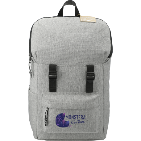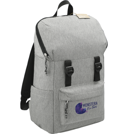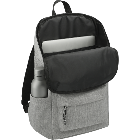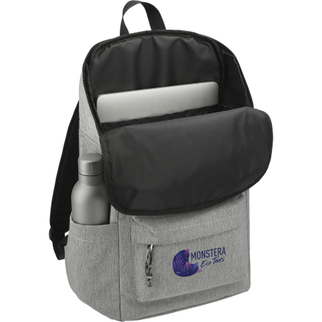 Merchant & Craft-simple classics for your modern lifestyle. The Merchant & Craft Revive Recycled 15" Computer Rucksack features RPET 600d material made from recycled water bottles. This backpack features a padded laptop sleeve that can hold up to a 15" laptop in the large, zippered main compartment. Keep your water bottle close by with the side water bottle pocket while keeping your mask and keys handy in the zippered front pocket. Carry in comfort with the padded, adjustable shoulder straps. Through a partnership with 1% For The Planet one percent of sales of this and all EcoSmart products will be donated to nonprofits dedicated to protecting the planet.