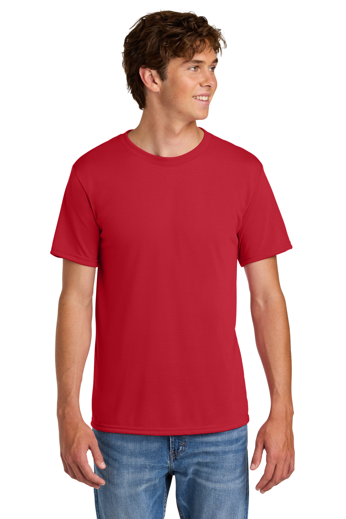 5-ounce 100% polyester jersey knitMoisture-wicking Anti-odor properties Recycled high-performing black tear-away label Seamed single-needle 3/4 collar Double-needle sleeves and bottom hem Safety Green is compliant with ANSI/ISEA 107 high visibility standards for background colorDue to the nature of 100% polyester performance fabrics special care must be taken throughout the printing process.Please note: This product is transitioning from tear-away labels to recycled high-performing black tear-away labels. Your order may contain a combination of both labels.