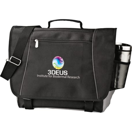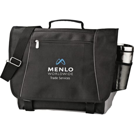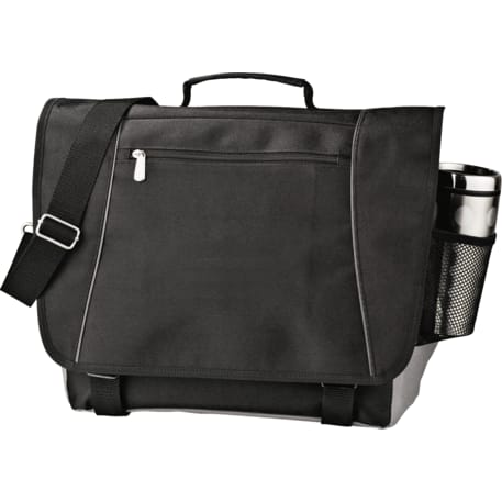 Large zippered main compartments can hold up to 15" laptop, accessories and documents. Zippered rear pocket for quick-access storage. Side mesh pocket fits beverage bottles. Additional storage on flap of zippered pocket. Business organizer hides securely under flap. Detachable, adjustable shoulder strap.