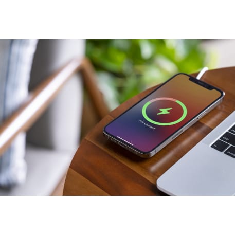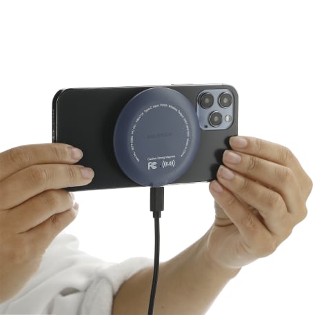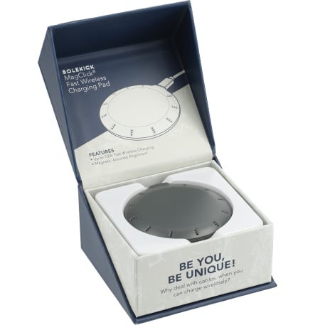 The Solekick™ MagClick™ Fast Wireless Charging Pad can be attached to iPhone 12/13 models magnetically for wireless charging. Supports three different wireless charging modes: 7.5W for iPhone X/8/8 Plus/XS/XS Max/XR/11/11 Pro/11 Pro Max/12/12 Pro/12 Pro Max/12 Mini/13/13 Pro/13 Pro Max/13 Mini; 10W for Samsung Galaxy S9/S9 Plus/S8/S8 Plus/Note 8/9 and more, and 5W standard charging for all other enabled devices. Includes a 39-inch USB-A-to-Type-C charging cable. It is recommended to use quick charge power adapter (10W at least, not included) to achieve fast charging. Packaged in a FSC certified premium gift box.