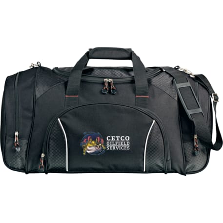 Large zippered main compartment. Zippered side pocket with organizer and separate zippered shoe compartment. Zippered front pocket with mesh organizer. Bottom board with feet. Padded, detachable, adjustable shoulder strap.