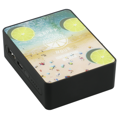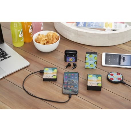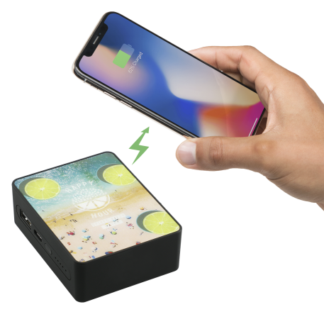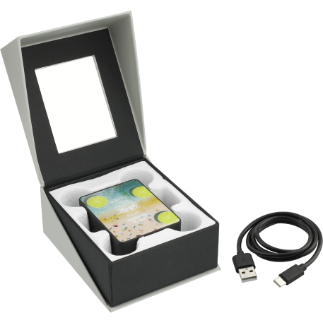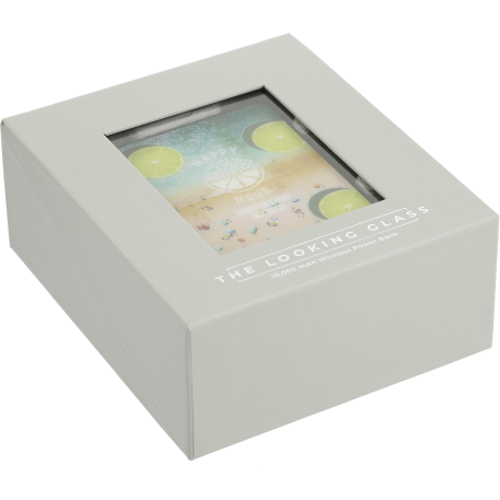 The Looking Glass 10,000 mAh Wireless Power Bank has a rechargeable lithium polymer battery (38.5Wh) that works as a charging pad or a regular power bank on the go. The tempered glass on the surface offers a vivid customized look. USB-A Output: 5V/2A. Supports 5W wireless charging for most newer devices. To charge a phone without wireless technology, an external Qi-standard wireless charging receiver or receiver case is required. This device will work with any smartphone or tablet – even ones without wireless technology – through the normal power bank capabilities. Works with most plastic phone cases on. Includes a 31-inch USB-A to Type-C charging cable. Packaged in a premium gift box. Power banks are permitted in carry-on luggage only, and at the discretion of TSA agents. Please charge power bank before initial use.