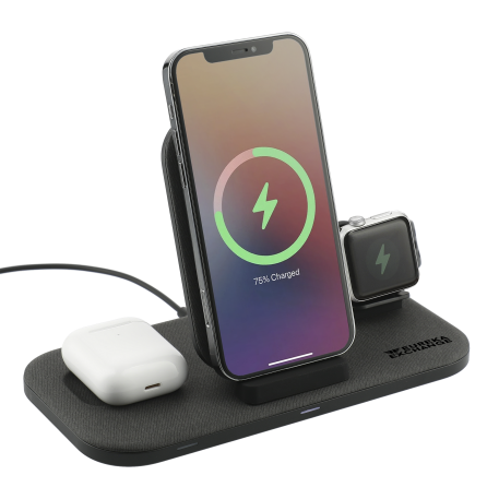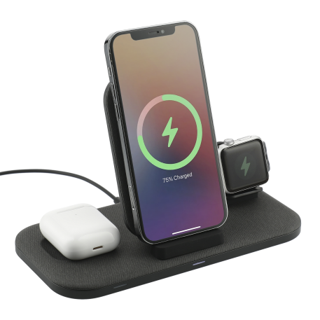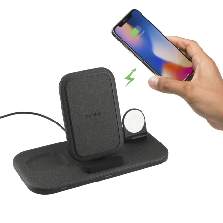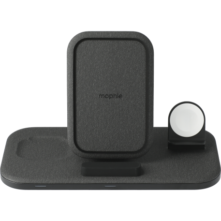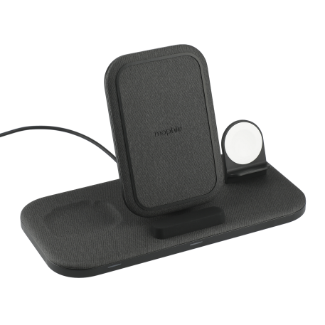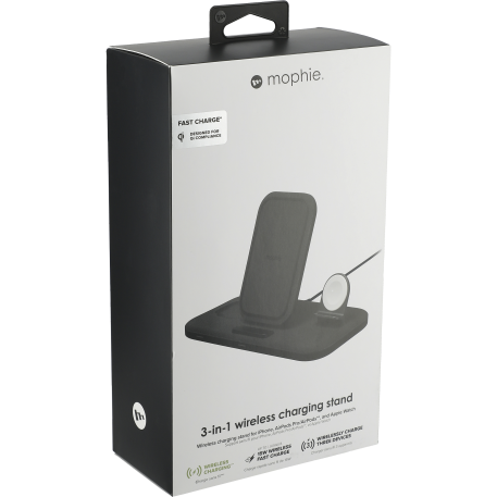 The mophie® 3-in-1 Wireless Charging Stand is designed with dedicated charging spots for smartphones, Apple Watches, and Airpods/Airpod Pros. It delivers up to 7.5W of power to iPhones or other enabled devices. The built-in Apple Watch charger holds the watch magnetically in place while charging. It works with most plastic phone/airpods cases on. A wall adapter and 9-inch charging cable are included. Packaged in a premium gift box. Qi Certified.