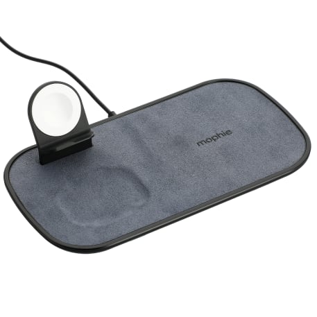 The mophie® 3-in-1 Fabric Wireless Charging Pad is designed with dedicated charging spots for smartphones, Apple Watches and Airpods/Airpod Pros. It delivers up to 7.5W of power to iPhones or other enabled devices. The built-in Apple Watch charger holds the watch magnetically in place while charging. It works with most plastic phone/airpods cases on. A wall adapter and 9-inch charging cable are included. Packaged in a premium gift box. Qi Certified.