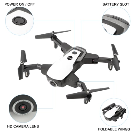 Foldable drone with Wifi Camera includes multiple features. Through the provided APP you are able to see the live video as you fly your drone. You can also save the image/Video. The drone can do forward, backward, sideward flight, including turn Left/Right, Up/Down, 3D roll, 3D flip, headless mode, one key automatic return, auto hovering and real-time image transmission. Flight Time: 6 Minutes up to 50 meters. Videos and Photos can be saved to your phone. The Drone doesn't have a slot for a memory card.