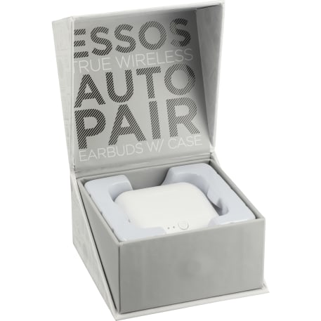 The Essos True Wireless Auto Pair Earbuds w/Case are the future of Bluetooth earbuds. As you see, there is no wire connecting the earbuds. Making them true wireless earbuds! The earbuds feature Bluetooth 5.0, Auto-Pairing, and Auto Power-On. Once the earbuds are removed from the case, they will power on and automatically sync to each other! No more hassle of trying to get the earbuds synchronized to each other. The case also doubles as a powerbank for your earbuds and can be charged with the included Micro USB Cable. Once the 400mAh battery of the case is charged, it will charge the earbuds 4x from 0-100%. With over 2hrs of playback time at max volume on a single charge these earbuds are a must for any traveler. The ergonomic design of the earbuds keep them in place on the go. The earbuds have built in music controls and dual microphones for hands free operation. It takes 1.5hrs to charge the earbuds from 0-100%. The case can be charged in under 1.5hrs.