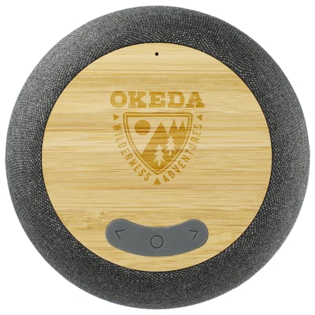 The Garm Fabric & Bamboo Speaker with Wireless Charging is perfect for the desk or countertop. The on-trend mixed material appearance of the bamboo and fabric wrap will get anyone’s attention. The 3-Watt output of the speaker produces crystal-clear sound. Plus, the top part of the speaker is a 5-Watt wireless charging pad that's capable of charging any compatible device. For wireless charging, this piece must be plugged in. The built-in 1200 mAh battery will keep the music playing for over 6 hours. Built-in music controls and microphone for hands-free operation. Bluetooth® version 5.1. A USB-A-to-Type-C charging Cable is included. The top of the speaker is made from FSC®-certified bamboo. The appearance of each piece may appear different because of the natural bamboo.