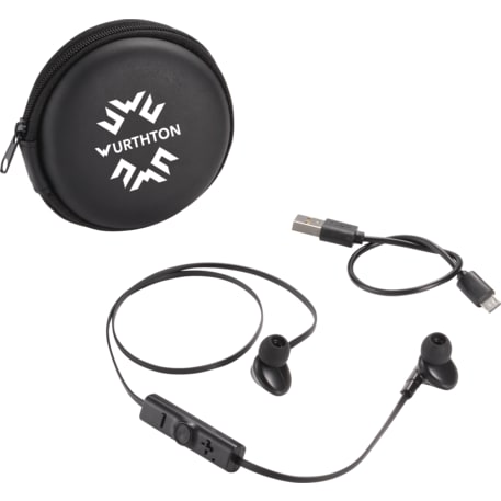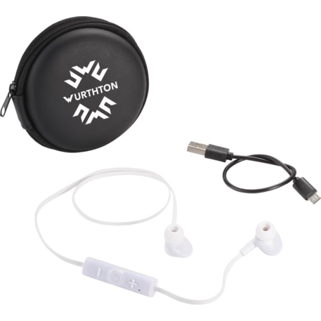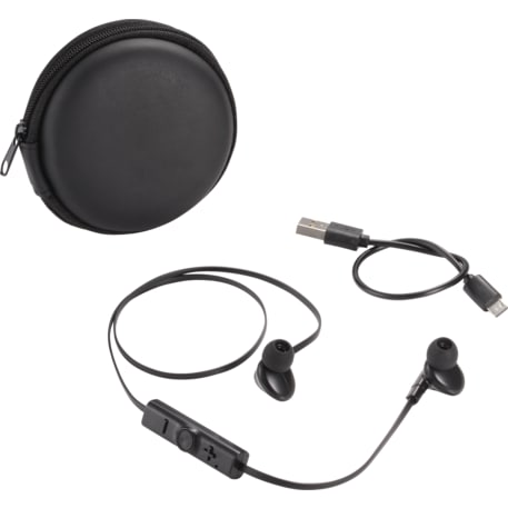 Lose the wire but keep the sound quality of your favorite earbuds. The Sonic Bluetooth earbuds connect wirelessly to any compatible device up to 33 feet. The ergonomic earbud design keeps them secure during all occasions. Plus they feature a built in control function and microphone which allows you to take calls and control the music without touching the connected device. Enjoy up to 4.5hrs of music at max volume on a single charge. It takes 1.5hrs to charge the earbuds from 0 to 100% Includes Micro USB Charging Cable, EVA zippered carrying case, and 2 extra silicone tips, small and large. 21" cable length.