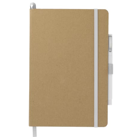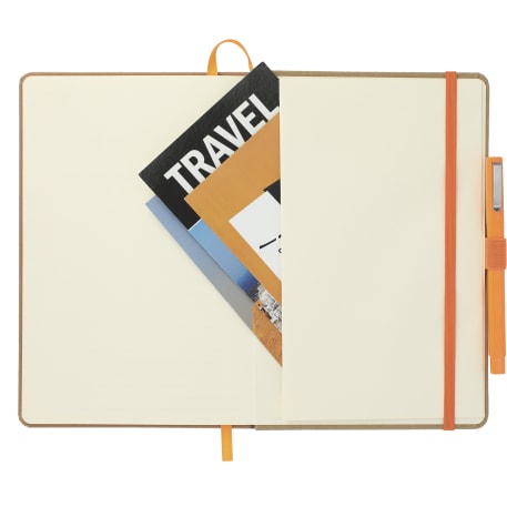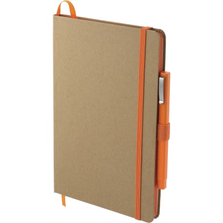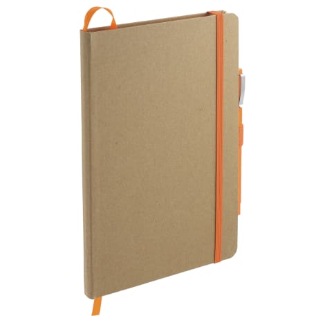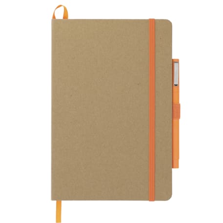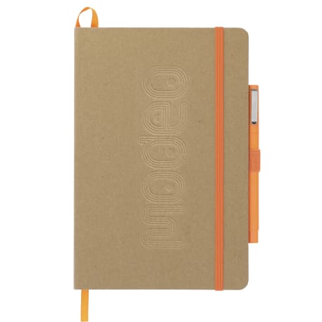 Set includes 2800-41 Eco Color Bound JournalBook and 6620-31 Ambassador Square Ballpoint. Recycled paper hard bound cover. Color accent painted edge pages. Color matching built-in elastic closure and pen loop. Ribbon page marker. Expandable accordion pocket. Includes 80 sheets of lined paper. Through a partnership with 1% For The Planet, one percent of sales of this and all EcoSmart products will be donated to nonprofits dedicated to protecting the planet. Due to the nature of the material, there may be color variances.