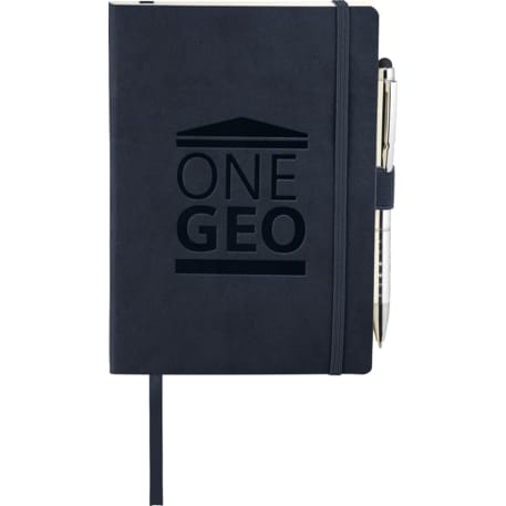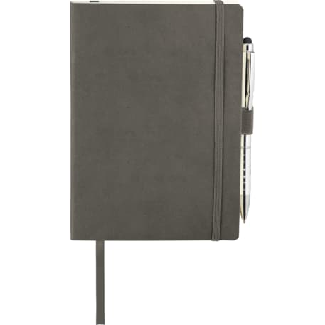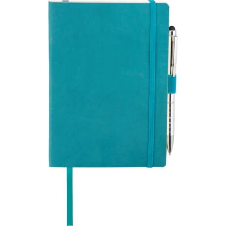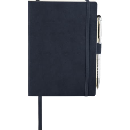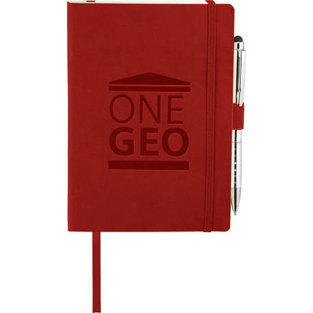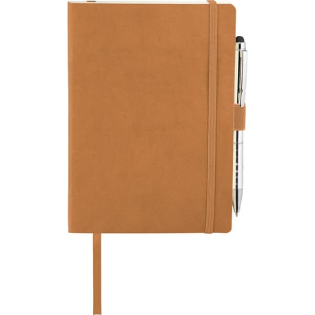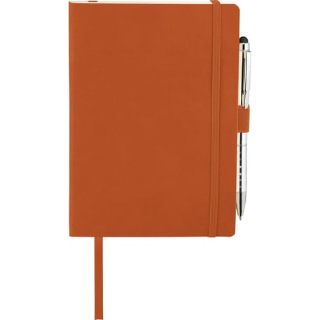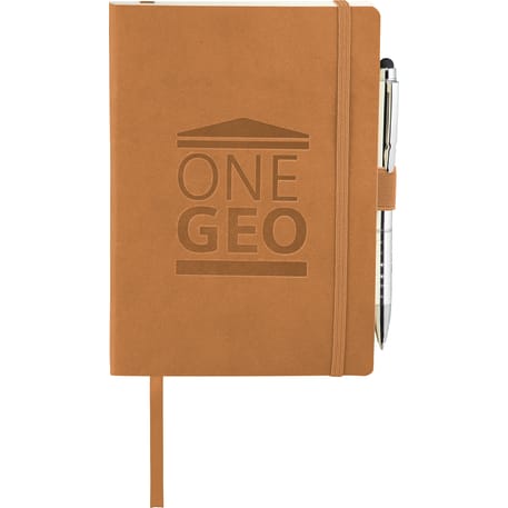 Set includes (2700-67) Revello Soft Bound JournalBook with (1065-08) Preston Dual Ballpoint Stylus with built in elastic closure. Ribbon page marker.Pen loop. Document pocket on interior back cover. Includes 80 sheets of cream lined paper. Free laser set up on metal pen!