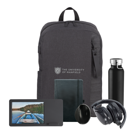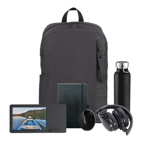 The Premium Work from Home Essential kit includes all of your important office accessories bundled together! To carry all of your premium home office accessories we included the 3950-01CA NBN Whitby 15" Slim Backpack. Inside of the backpack will be the 7197-17BK Light Up Logo Bluetooth Headphones, 1625-85BK Thor Copper Vacuum Insulated Bottle 22oz, 2700-07BK Pedova Pocket Bound JournalBook, 7141-84BK Glimpse Photo Frame with Wireless Charging, and 7142-15BK Wireless Ergonomics Optical Mouse. Please reference the individual product page for more production specifications. Decoration included on the bag only