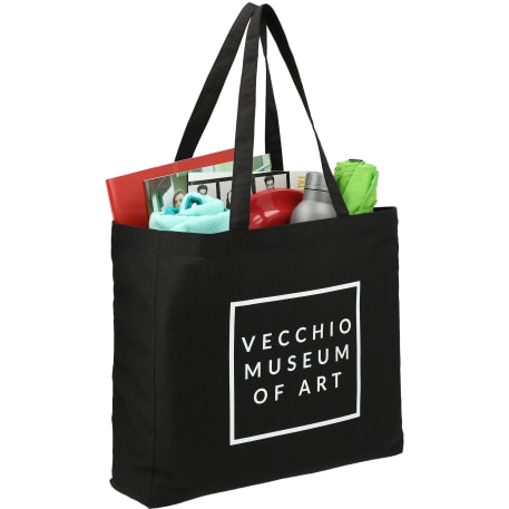 Clean design gives this tote large imprint areas and is a great option for meetings, conventions and tradeshows. Also a perfect alternative to plastic bags. Open main compartment. 11" drop handle height.