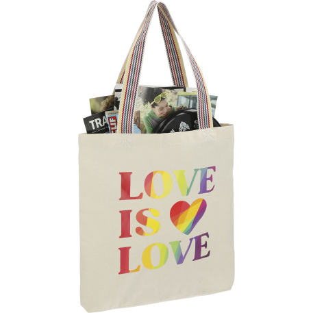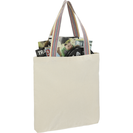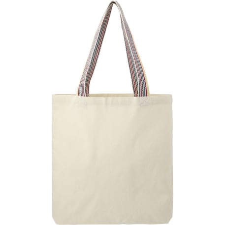 Instantly update any event with the Rainbow Recycled 6oz Cotton Convention Tote. This convention tote is made from pre-consumer recycled cotton, and features rainbow webbing handles and an open main compartment. The perfect tote for any convention or trip to the market.