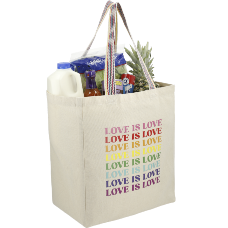 An instant upgrade to the regular cotton grocery and shopper tote is the Rainbow Recycled 8oz Cotton Grocery Tote. Made from pre-consumer recycled cotton, this grocery tote features rainbow webbing grab handles, and makes a perfect grab and go bag for the farmer's market, grocery store, or shopping trip.