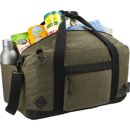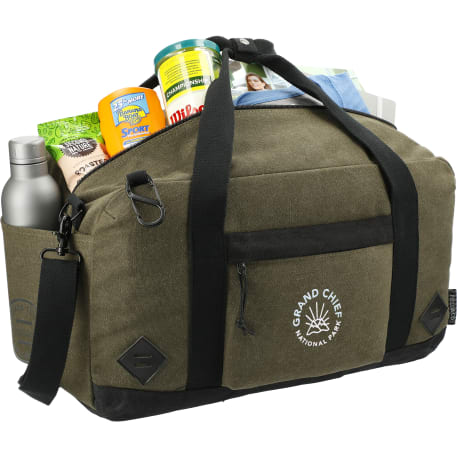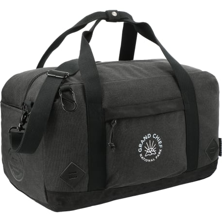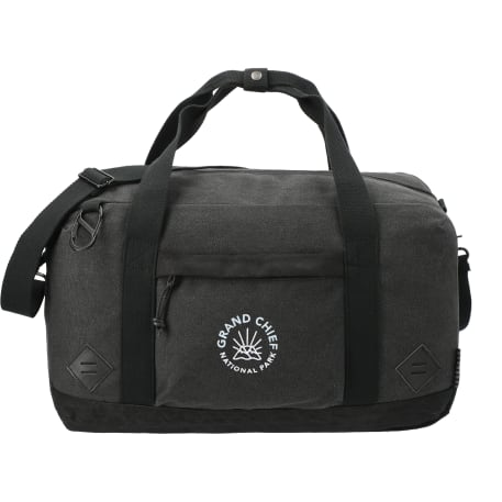 The Field & Co. Woodland Duffel is made from sturdy cotton canvas and features custom wood grain lining. This duffel includes a removable carabiner to hold your keys or favorite camp mug. It has a spacious zippered main compartment, zippered front accessory pocket, and two premium diamond lash tabs for attaching additional carabiners. Carry this duffel using the removable, adjustable shoulder strap or the webbing grab handles. The bottom is a durable waxed cotton canvas and will have a distressed look due to the waxing process.