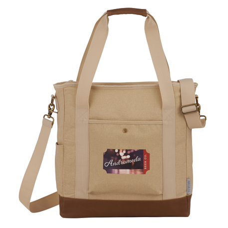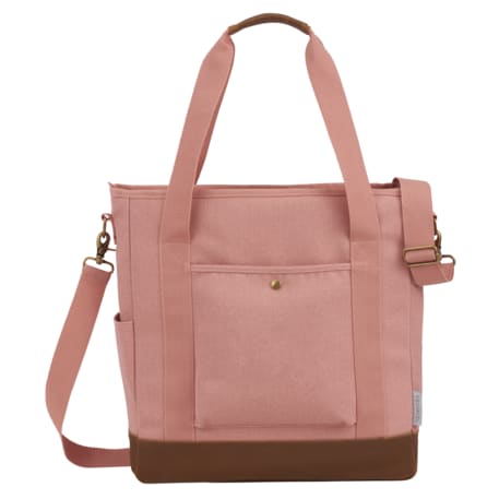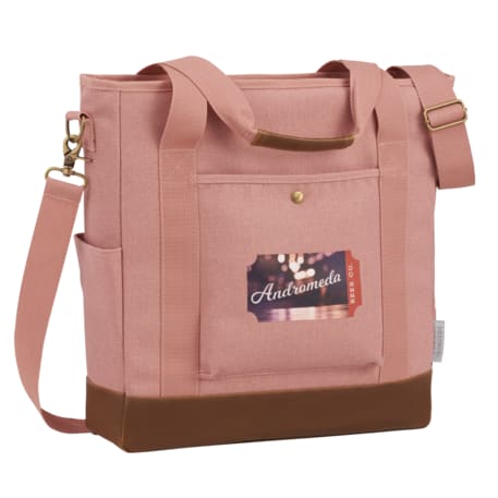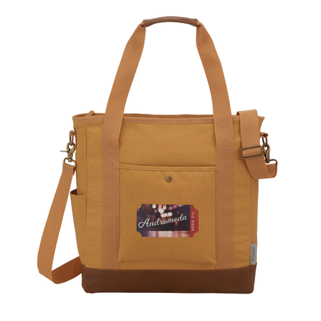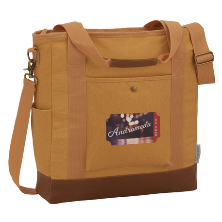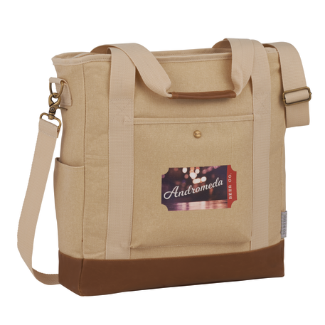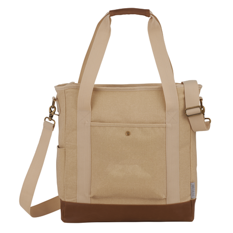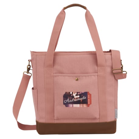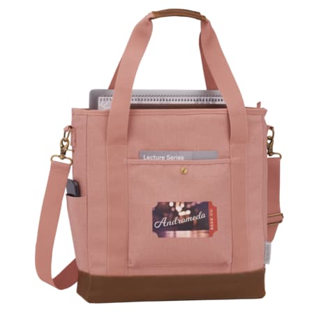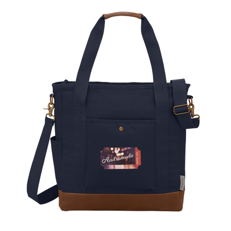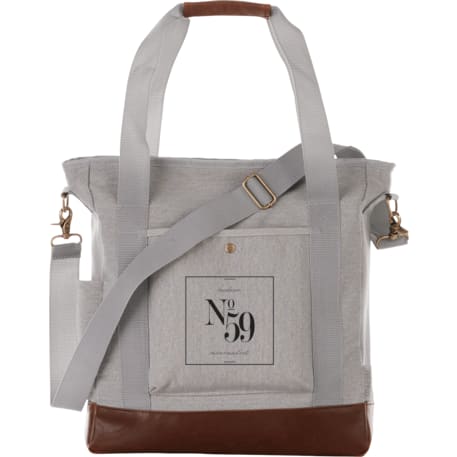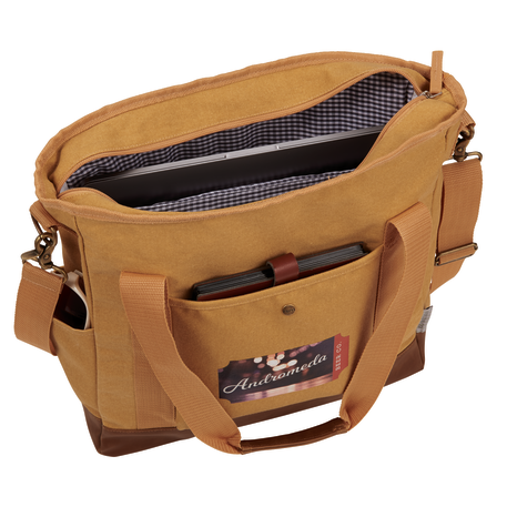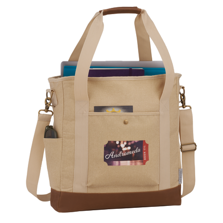 Open main compartment with patterned lining. Front pocket with snap closure. Vinyl accent bottom and carry handles. Trolley strap on back. Adjustable length shoulder strap. Disclaimer: Due to the dyes used & natural fabric, there will be slight color variations from the images shown.