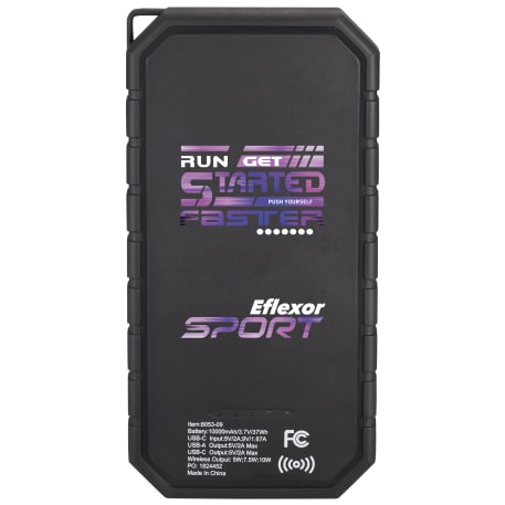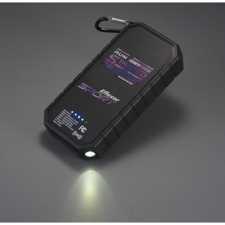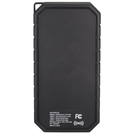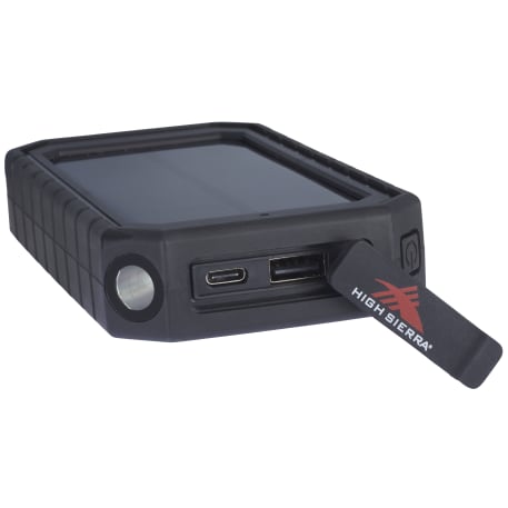 The High Sierra® IPX5 Solar Fast Wireless Power Bank has a 10,000 mAh rechargeable lithium polymer battery (37Wh) that works as a wireless charging pad or normal power bank. It has a solar panel, a built-in flashlight and a carabiner clip for easy carrying. IPX5 Waterproof. USB Output: 5V/2.4A; Type-C Output: 5V/2.4A. Supports three wireless charging modes: 7.5W for All iPhone 8/X/11/12/13 Series; 10W for Samsung Galaxy S9/S9 plus/S8/S8 Plus/Note 9/8 and more, and 5W standard charging for all enabled devices. To charge phones without wireless technology, an external Qi-standard wireless charging receiver or receiver case is required. Wired charging will work with any smartphone or tablet. Works with most plastic phone cases on. Includes a USB-to-Type-C charging cable. Color of solar panel may vary from every batch. Power banks are permitted in carry-on luggage only, and at the discretion of TSA agents. Please charge power bank before initial use.