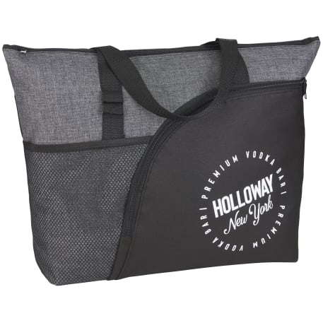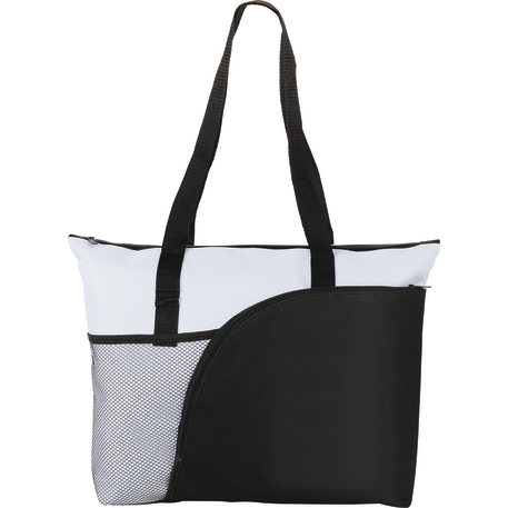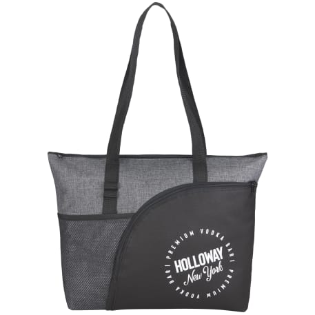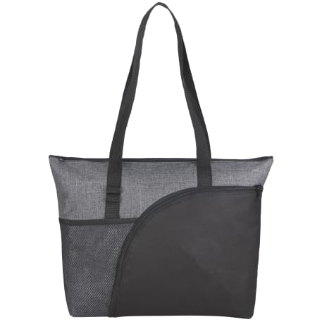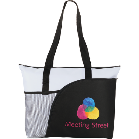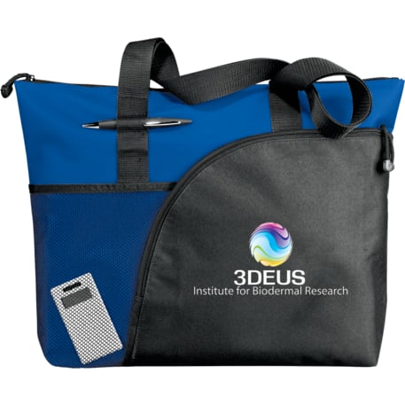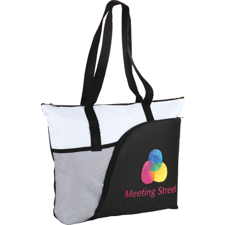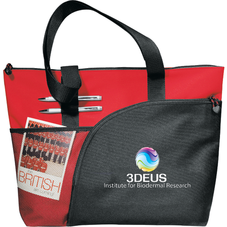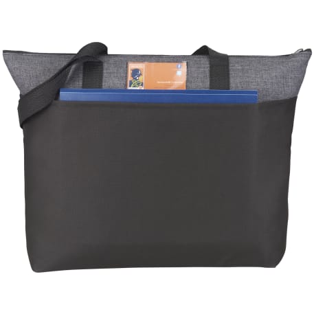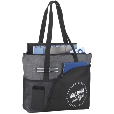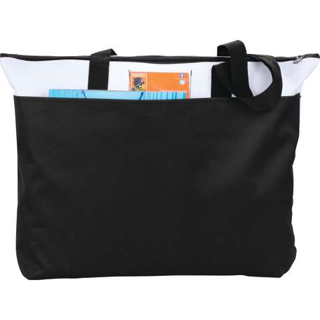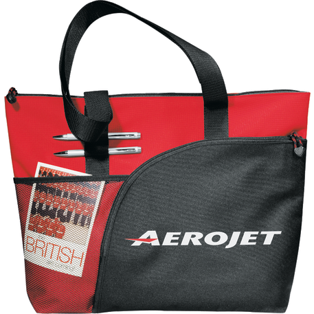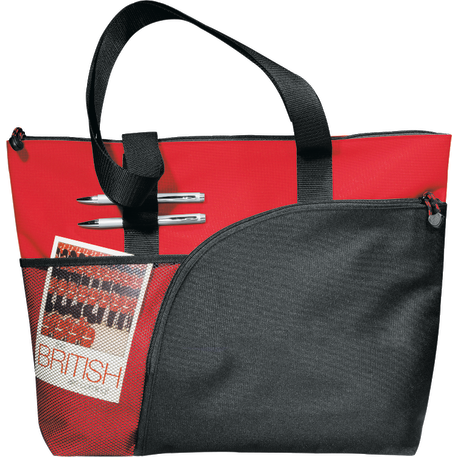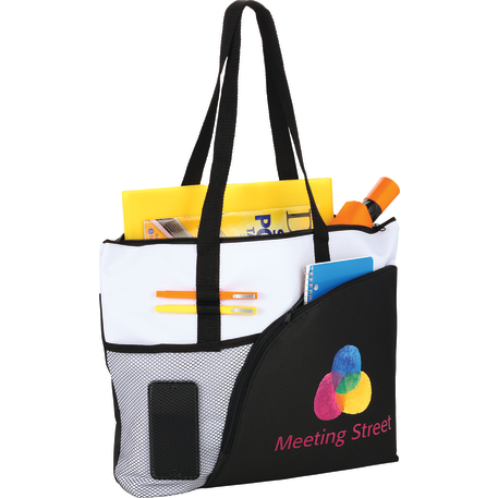 Great for tradeshows, conventions, and business meetings. Zippered main compartment. Zippered front pocket. Front mesh pocket. Pen loops. Rear ID window. Open back pocket. 12" handle drop height.