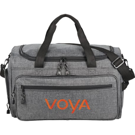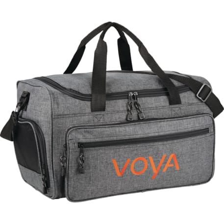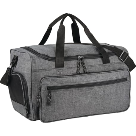Zippered main compartment with bottom board. Zippered end pocket for shoes. Gusseted front pocket. Detachable, adjustable shoulder strap.