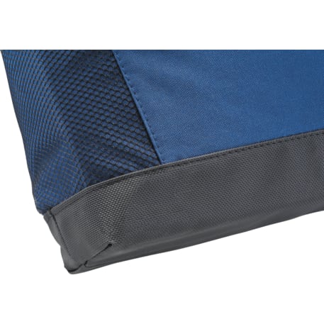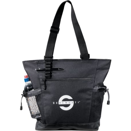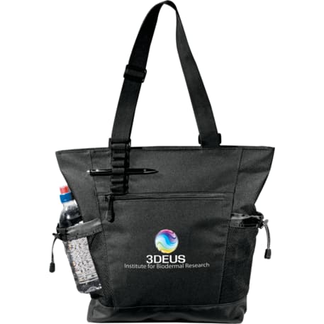 Great for tradeshows, conventions and business meetings. Zippered main compartment. Zippered front pocket. Side mesh drawstring pockets. Pen loops. 15" handle drop height.