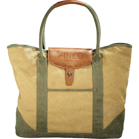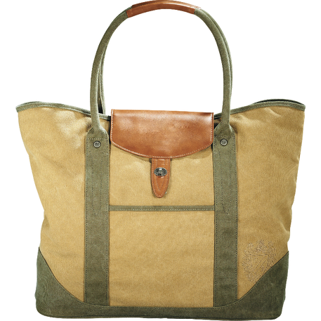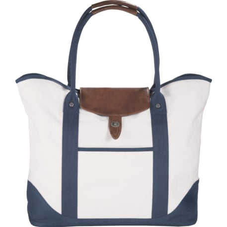 This oversized carry-all tote is great for travel or even the beach. Open main compartment features a leather flap with turnlock closure. 8" handle drop height with leather comfort wrap. Made of rugged 21oz cotton canvas and lined with Cutter & Buck® sleek, striped signature lining. Antique nickel hardware and Cutter & Buck® branding help complete this piece.