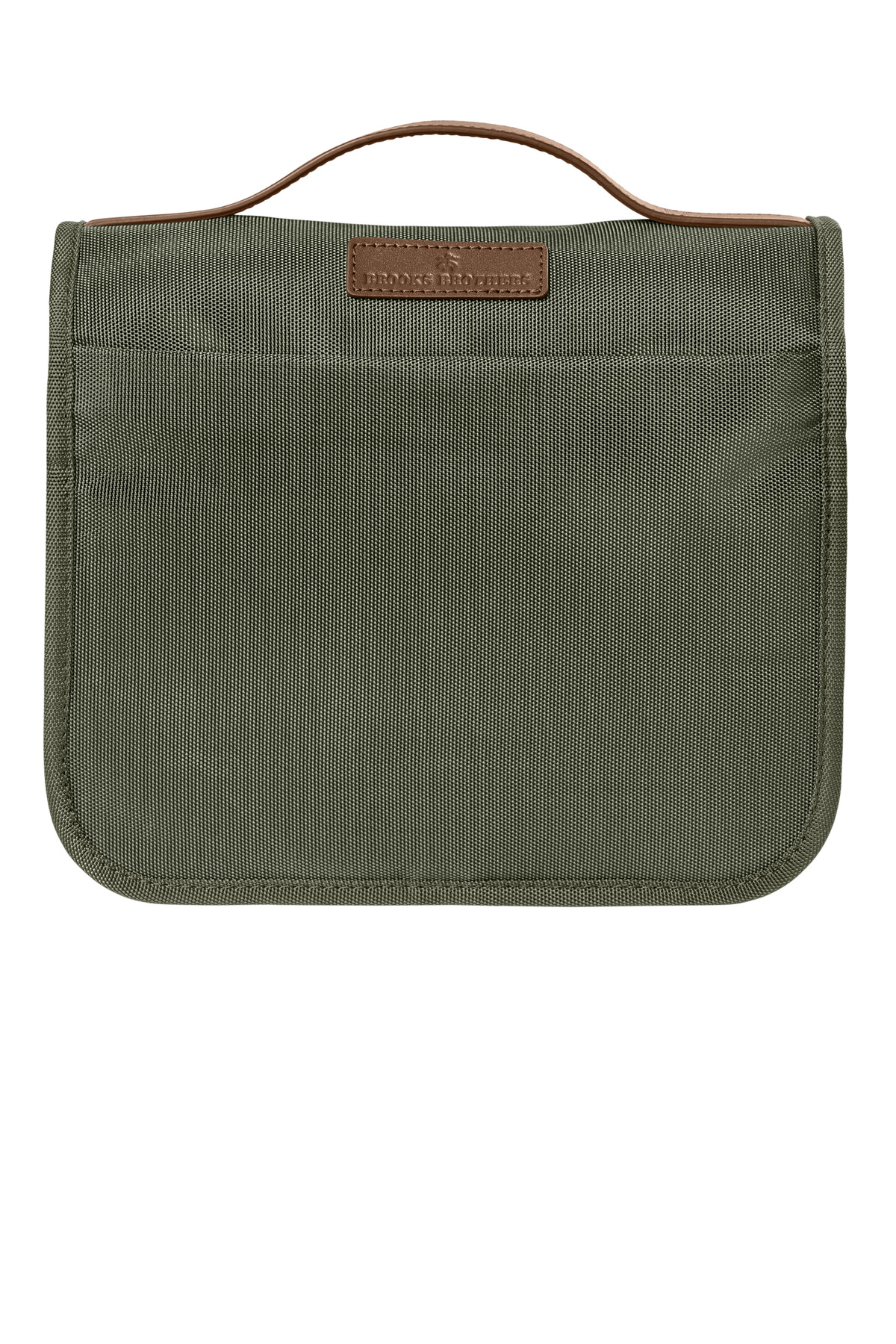 Perfectly compact this is the ultimate hanging toiletry kit ready for any travel itinerary. 500D x 750D polyester with knitted fabric backing 420D polyester lining Genuine leather trim and details Front zippered pocket for decoration access Magnetic snap closure on flap Foldaway metal hook on flap for hanging Two zippered mesh compartments on flap Zippered main compartment with interior elastic mesh slip pockets Leather top handle Leather zipper pulls with Brooks Brothers logo rivet Exterior debossed Brooks Brothers leather label Dimensions: 9 h x 9.75 w x 3.5 d Capacity: 305 cu. in./5 L Weight: .77 lbs./0.35 kgNote: Bags not intended for use by children 12 and under.