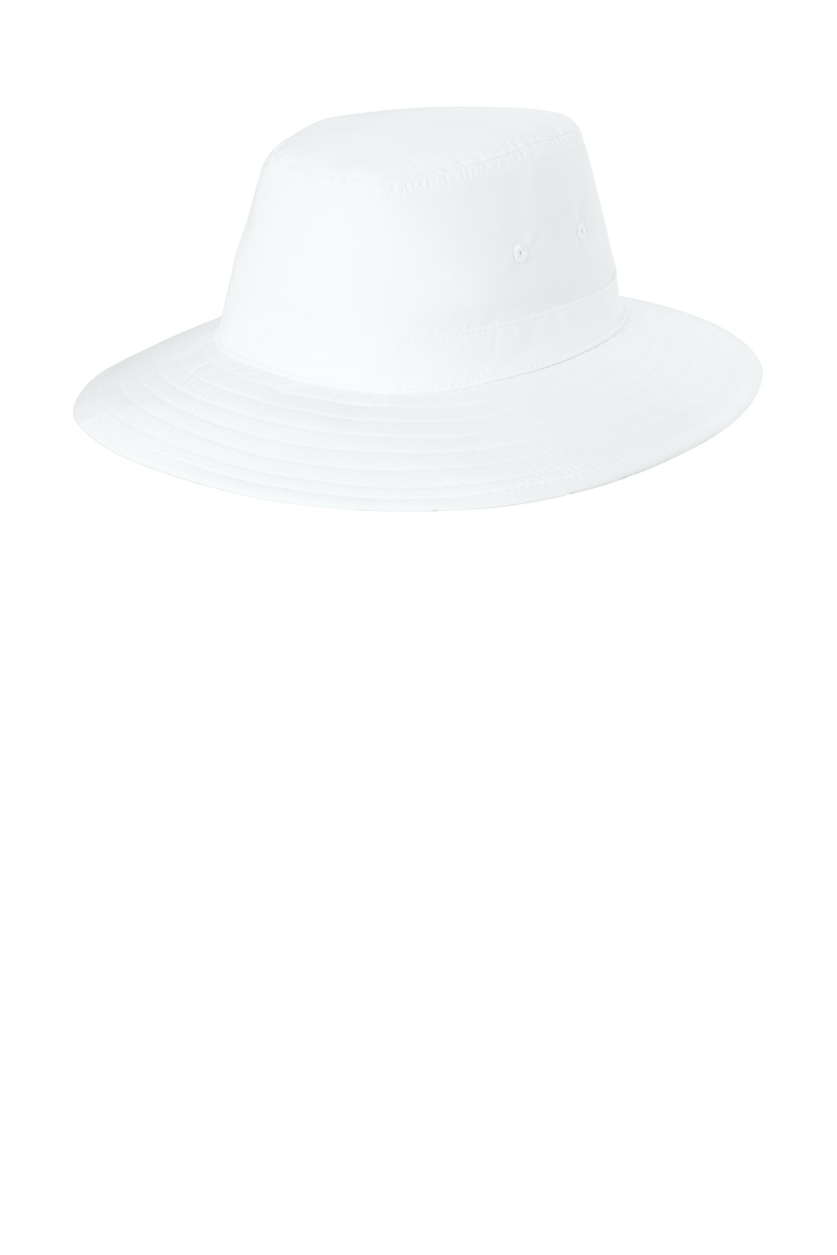 With UPF 30+ sun protection a moisture-wicking sweatband and a durable water-repellent (DWR) finish this hat is perfect for golfing lounging on the beach watching outdoor events and more. Fabric: 100% polyester microfiber Features: Fixed adjustable shock cord