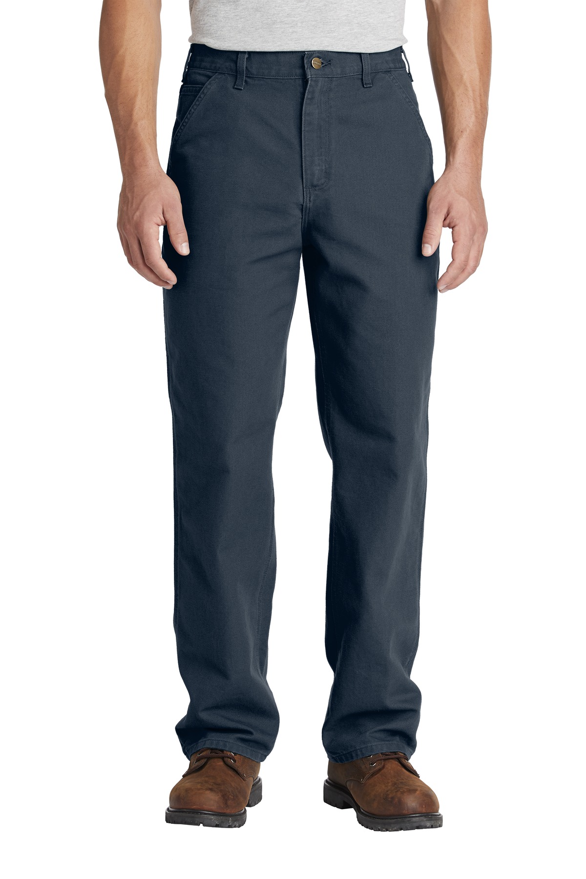 Long days on the job site or making repair calls require pants that are comfortable and durable. These pants let you move freely and theyre tough as a steel beam. 12-ounce 100% cotton ring spun washed duck canvas Sits slightly above the waist Generous fit through the seat and thigh with the most room to move Multiple tool and utility pockets Left-leg hammer loop Stronger sewn-on-seam belt loops Heavy hauling reinforced back pockets Straight leg opening fits over boots Carhartt leatherette label sewn on right rear pocket Loose fit