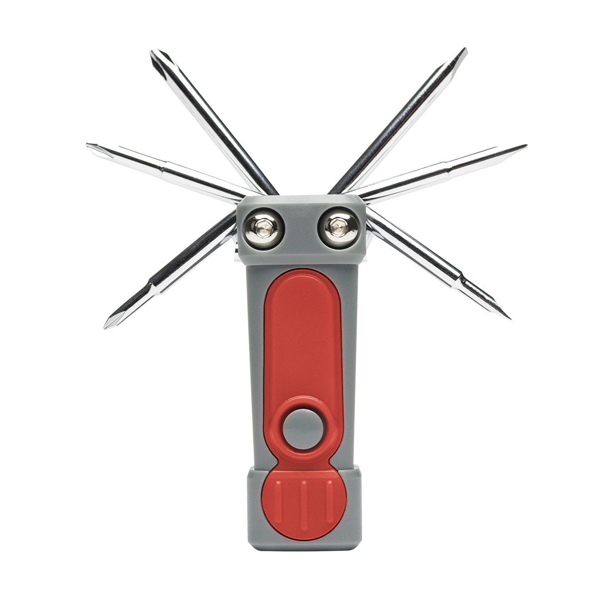 Made Of ABS And Stainless Steel | 3 Flat Head And 3 Phillips Head Bits | Extra Bright White LED Light | Extra Bright White COB Light | Push Flashlight Button Once For Front Light, Push Again For Back Light, Push Again To Power Off | Button Cell Batteries Included