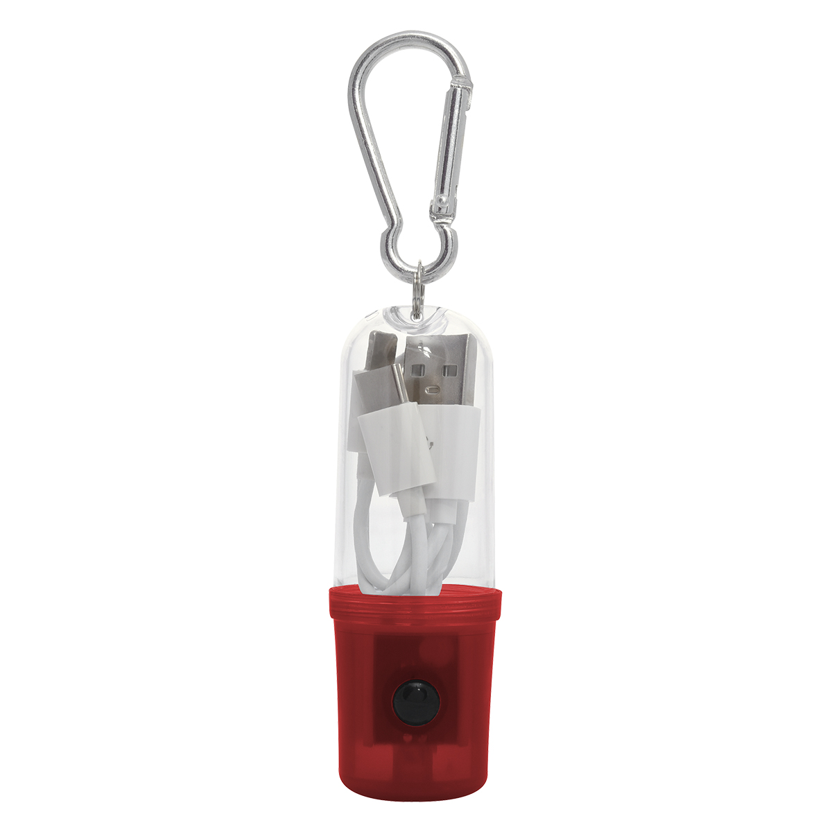 Compatible With Apple® 8-Pin, Micro USB And Type-C Devices | Extra Bright White LED Light | Two Light Settings - High And Flashing | Carabiner Attachment | Button Cell Batteries Included | Use Type-A Power Sources To Charge Existing Devices