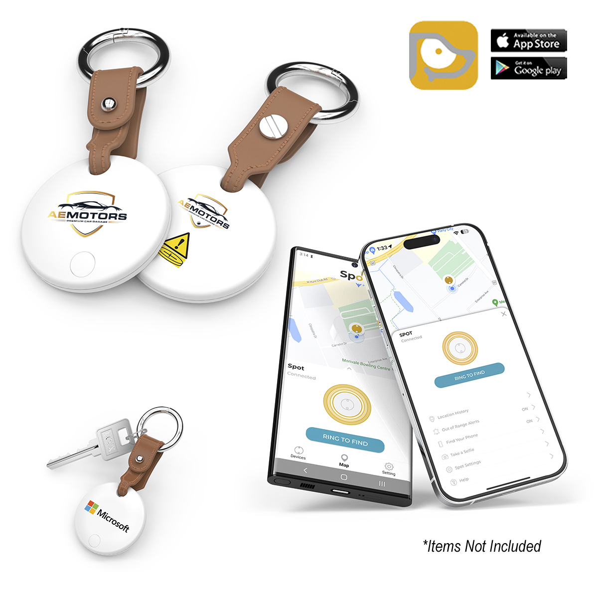 Two-Way Finding Helps Locate Smart Phone or Spot Pro Device | Features Bluetooth® 4.0 Technology | Attach The Spot Pro Finder To Keys, Purse, Etc. | Includes Faux Leather Strap And Round Metal Carabiner | Find Mode Sounds An Alarm From The Spot Pro Device To Locate It | Tether Mode Can Send An Alert Before You Leave Behind Important Items | Connect And Manage Up To Four Spot Pro Devices | Replaceable Battery | Free App For IOS and Android Devices | The Bluetooth® word mark and logos are registered trademarks owned by the Bluetooth SIG, Inc. and any use of such marks by Hit Promotional Products, Inc. is under license. Other trademarks and trade names are those of their respective owners.