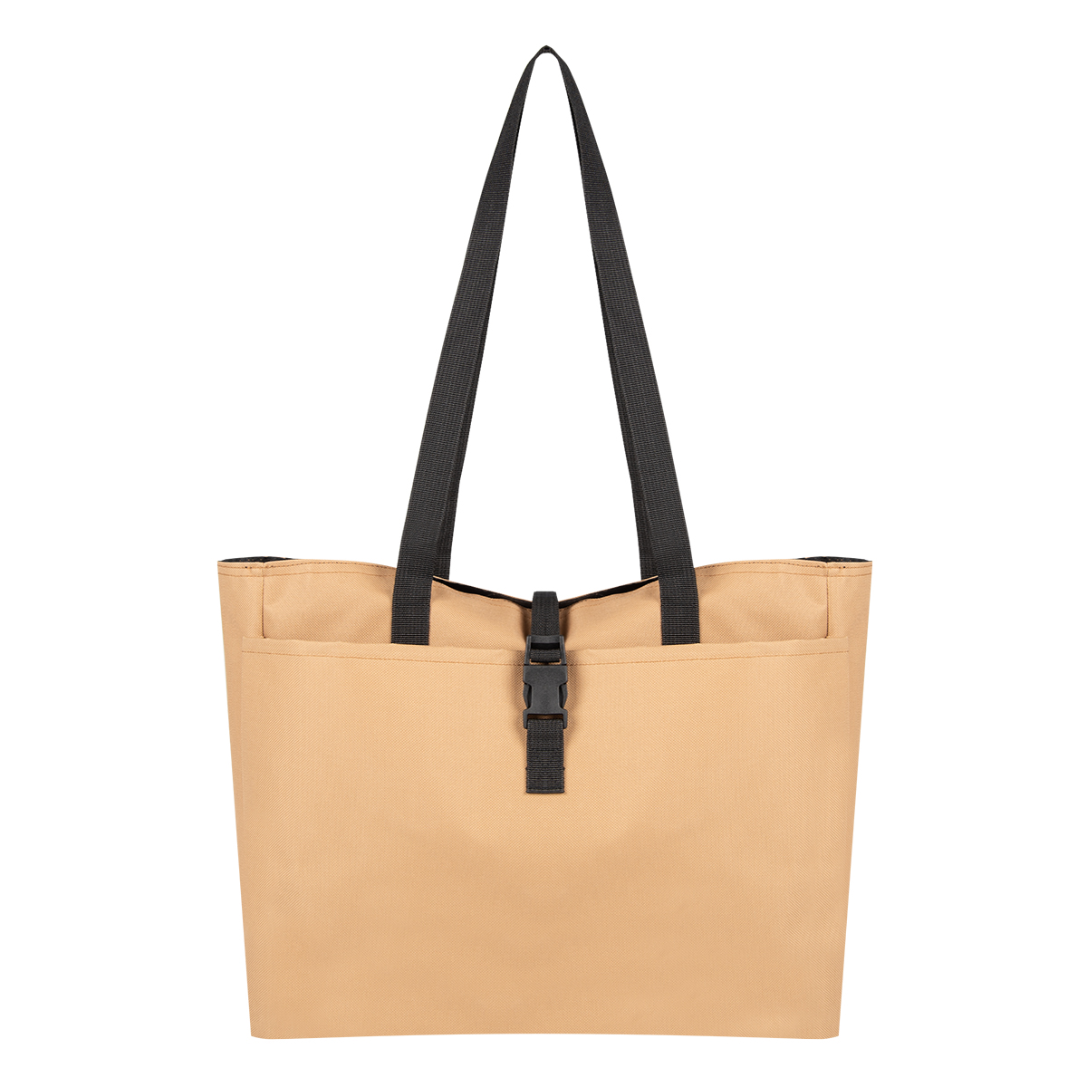Made Of Combo: 600D Polyester With 190T Lining | Large Open Main Compartment And Front Slip Pocket With Plastic Buckle Closure | 31" Handles | 5 ¾" Gusset | Spot Clean/Air Dry