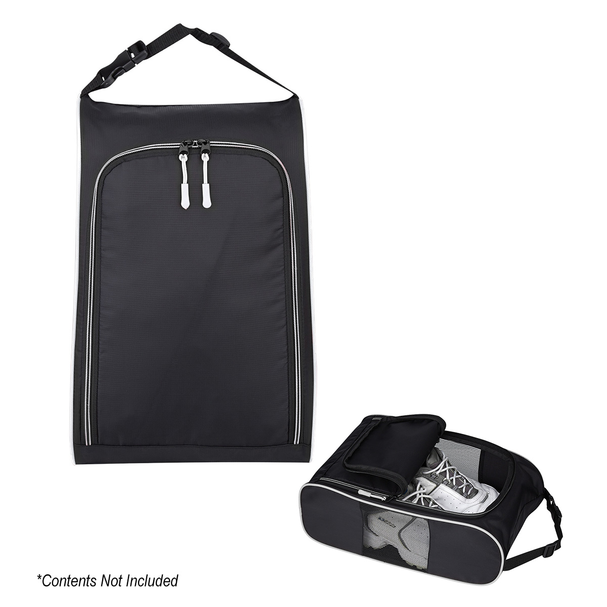 Made Of 420D Polyester | Double Zippered Main Compartment | Side Mesh For Ventilation | Adjustable Web Carrying Handle With Buckle Closure | Accommodates Most Shoes Up To US Men’s Size 12 | Spot Clean/Air Dry