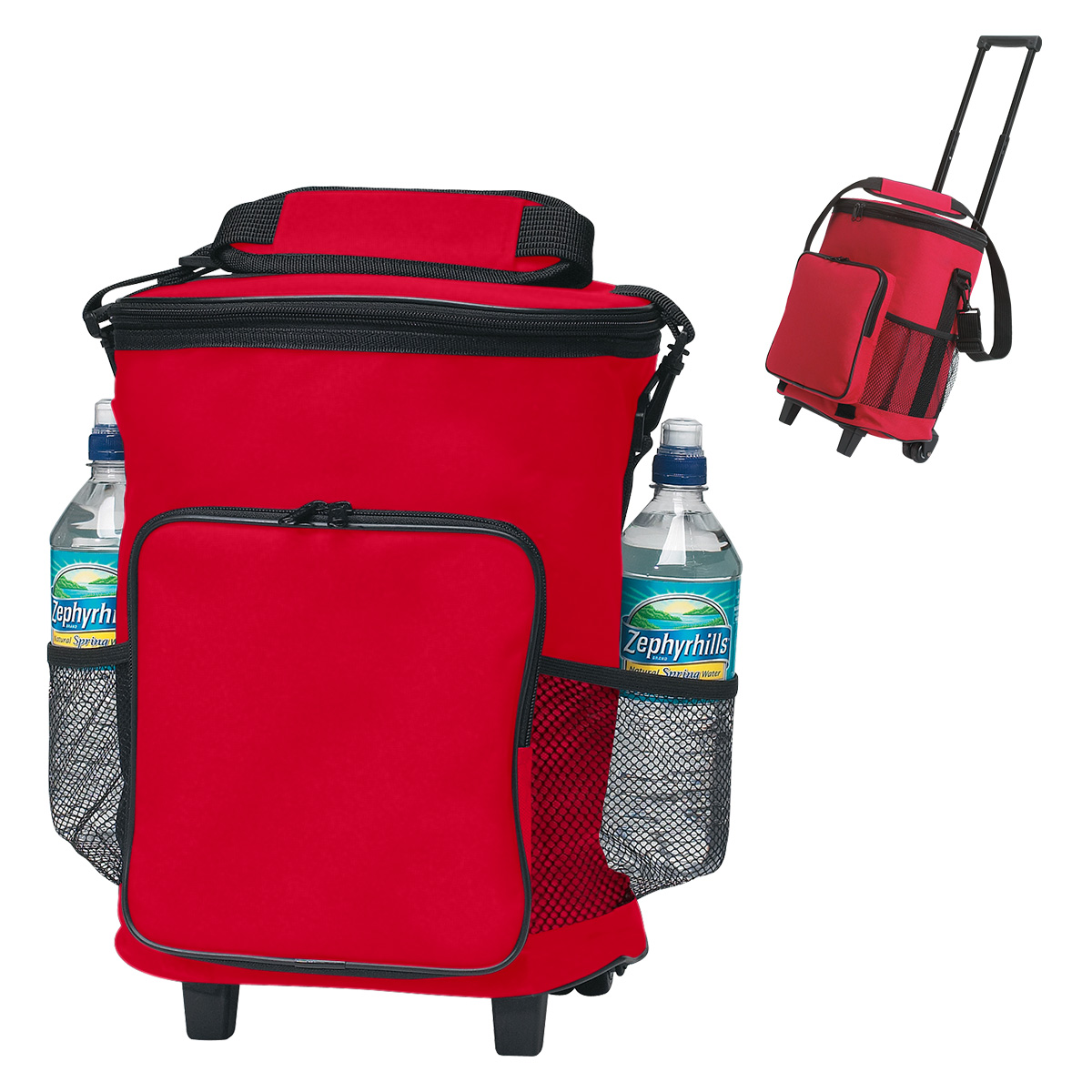 Made Of 420D Polyester | PEVA Lining | Detachable/Adjustable Padded Shoulder Strap | 2 Side Mesh Pockets | Front Zippered Pocket | Double Zippered Main Compartment | Retractable Auto Lock Handle Rolling Cooler With Wheels | Collapsible For Easy Storage | Holds Up To 18 Cans | Spot Clean/Air Dry