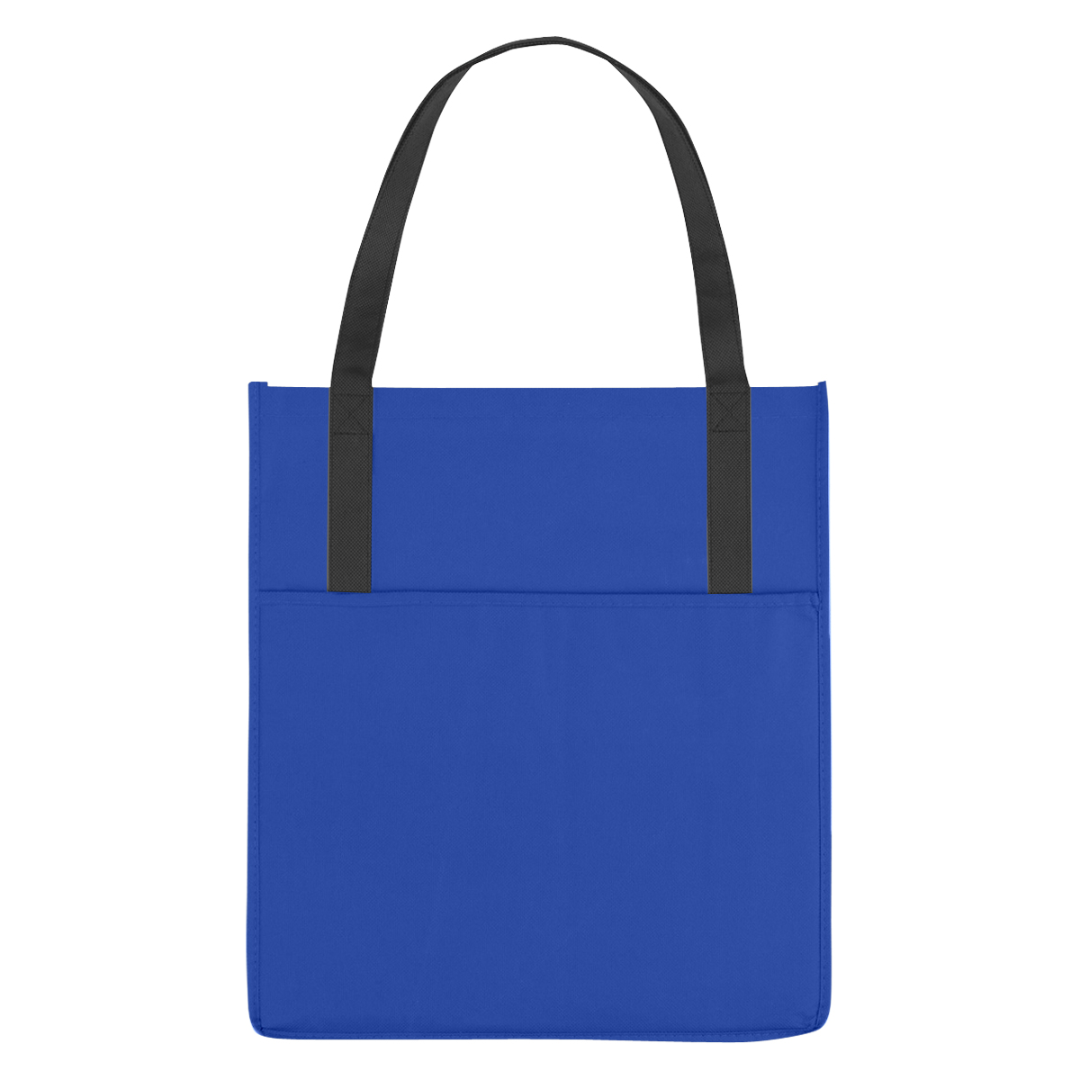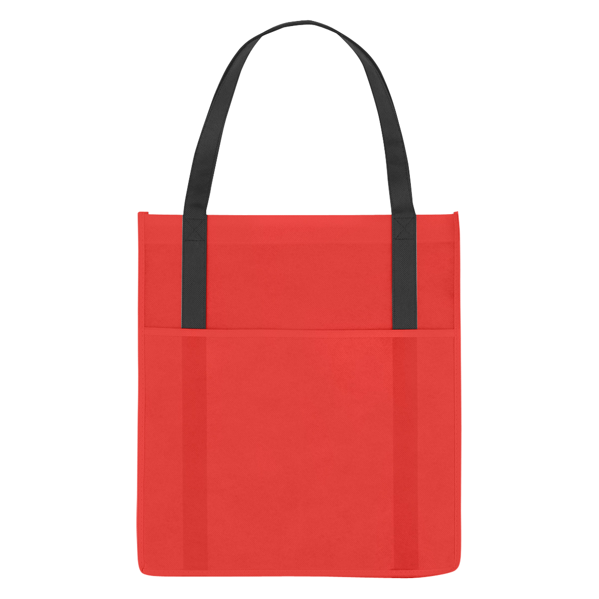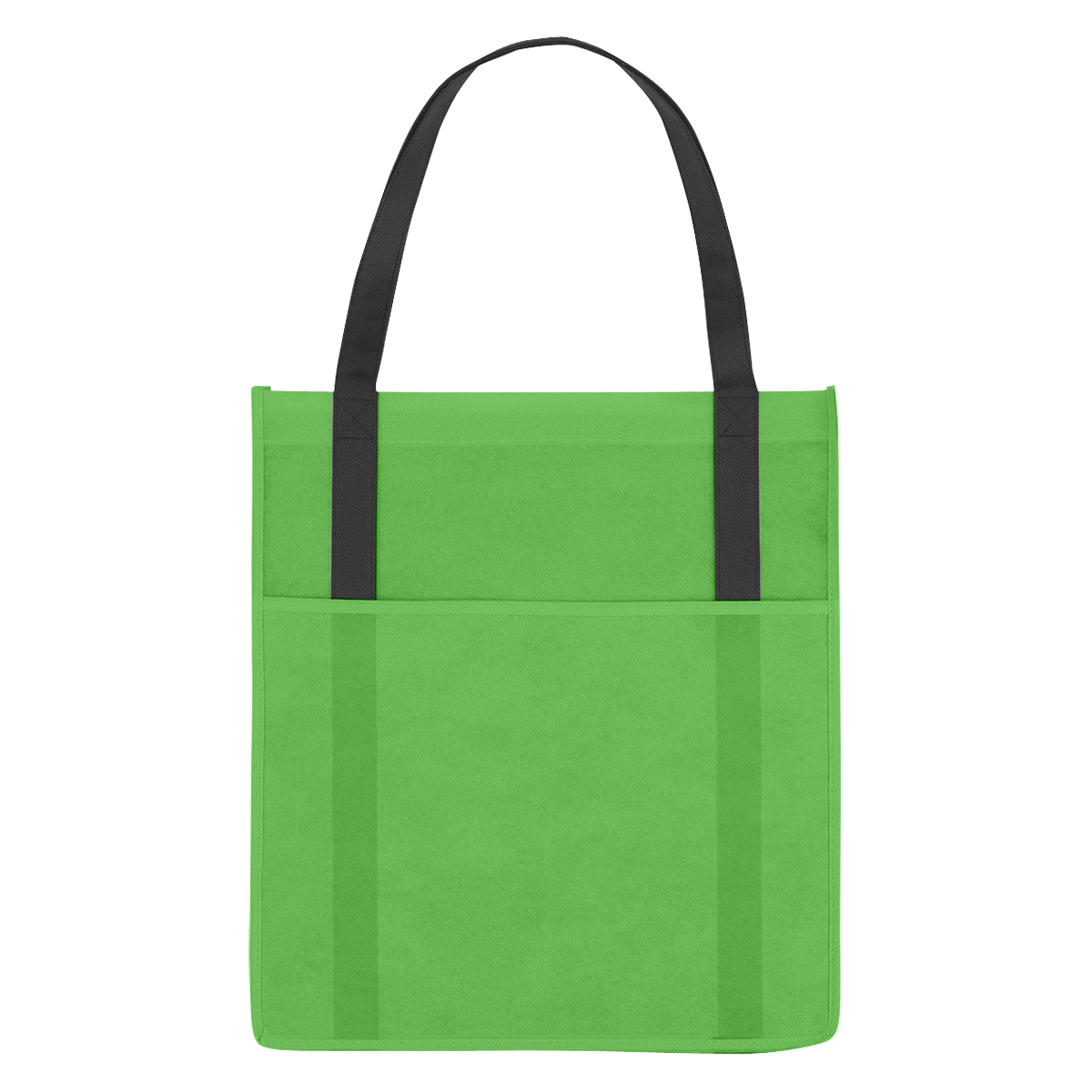 Made Of 80 Gram Non-Woven, Coated Water-Resistant Polypropylene | Great For Grocery Stores, Markets, Book Stores, Etc. | Front Pocket | 9 ½" Gusset With Covered Bottom Insert | Reusable | 20" Handles | Spot Clean/Air Dry | This Material Is Recyclable In Limited Facilities In The US. Consumers Should Check Their Local Recycling Capacities Before Placing In Their Recycling Bins.