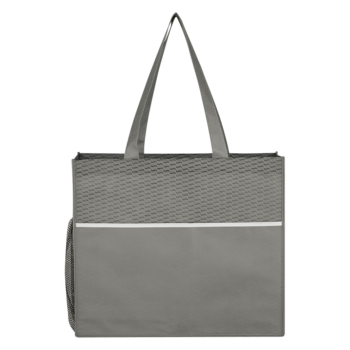 Made Of 80 Gram Non-Woven, Coated Water-Resistant Polypropylene | Large Front Pocket | Side Mesh Pocket | 3 ½" Gusset | 17" Handles | Spot Clean/Air Dry | This Material Is Recyclable In Limited Facilities In The US. Consumers Should Check Their Local Recycling Capacities Before Placing In Their Recycling Bins.