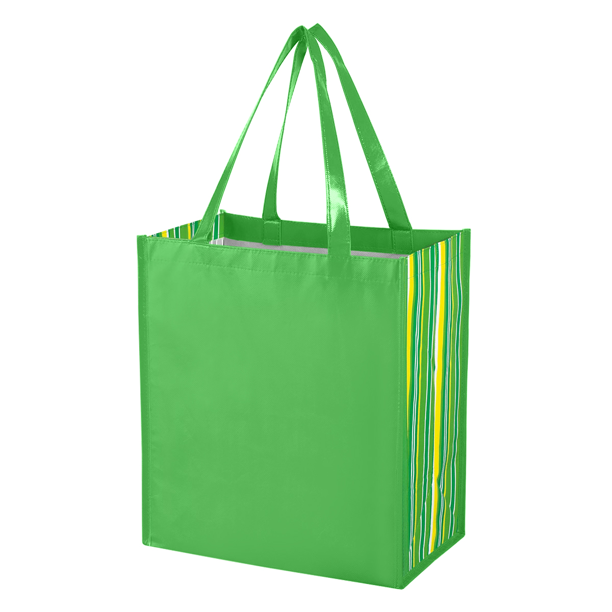 Made Of 80 Gram Laminated Non-Woven, Coated Water-Resistant Polypropylene | Great For Grocery Stores, Markets, Book Stores, Gift Bags, Etc. | 8" Striped Side Gusset | Reusable | 21" Handles | Spot Clean/Air Dry | This Material Is Recyclable In Limited Facilities In The US. Consumers Should Check Their Local Recycling Capacities Before Placing In Their Recycling Bins.