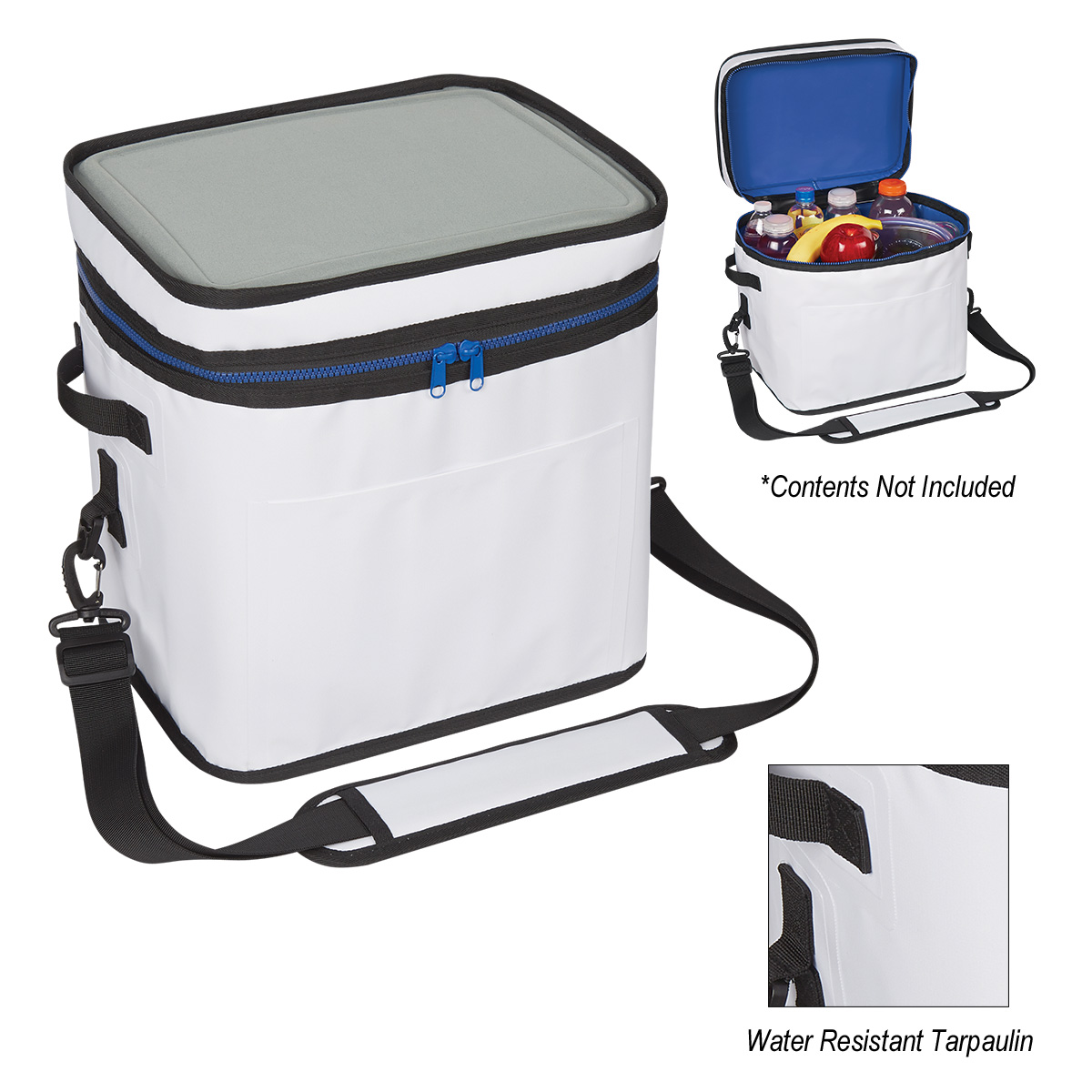Made Of 500D PVC Tarpaulin And 900D Nylon | PVC Lining With EPE Foam Insulation | Detachable/Adjustable Padded Shoulder Strap And Web Carrying Handles | Large Front Pocket | Double Zippered Main Compartment | Resistant To Water, Punctures, Mildew and UV Rays | Spot Clean/Air Dry