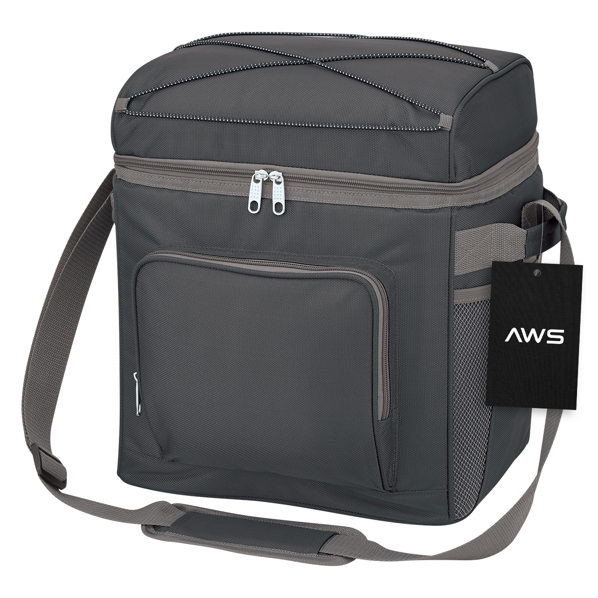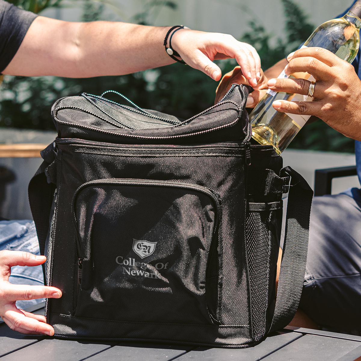 Made Of 680D Polyester | PEVA Lining | Adjustable Padded Shoulder Strap And Web Carrying Handles | Two Side Pockets With Mesh Accents | Front Zippered Pocket | Inside Mesh Zippered Pocket | Double Zippered Main Compartment | Bungee Cord Storage On Top | Holds Up To 24 Cans | Spot Clean/Air Dry