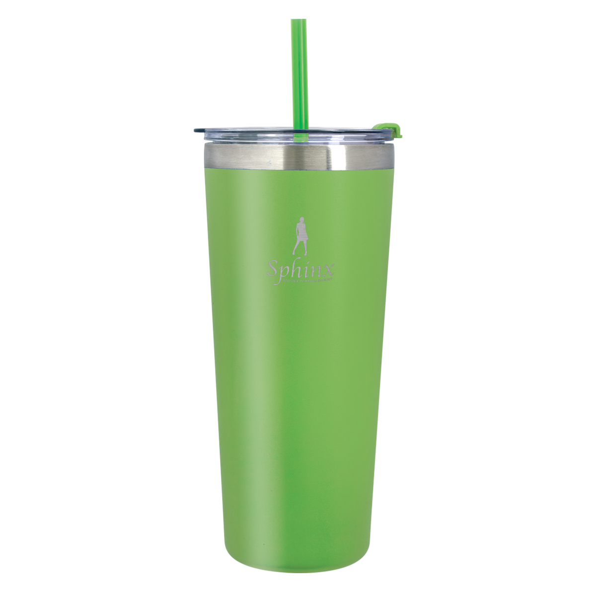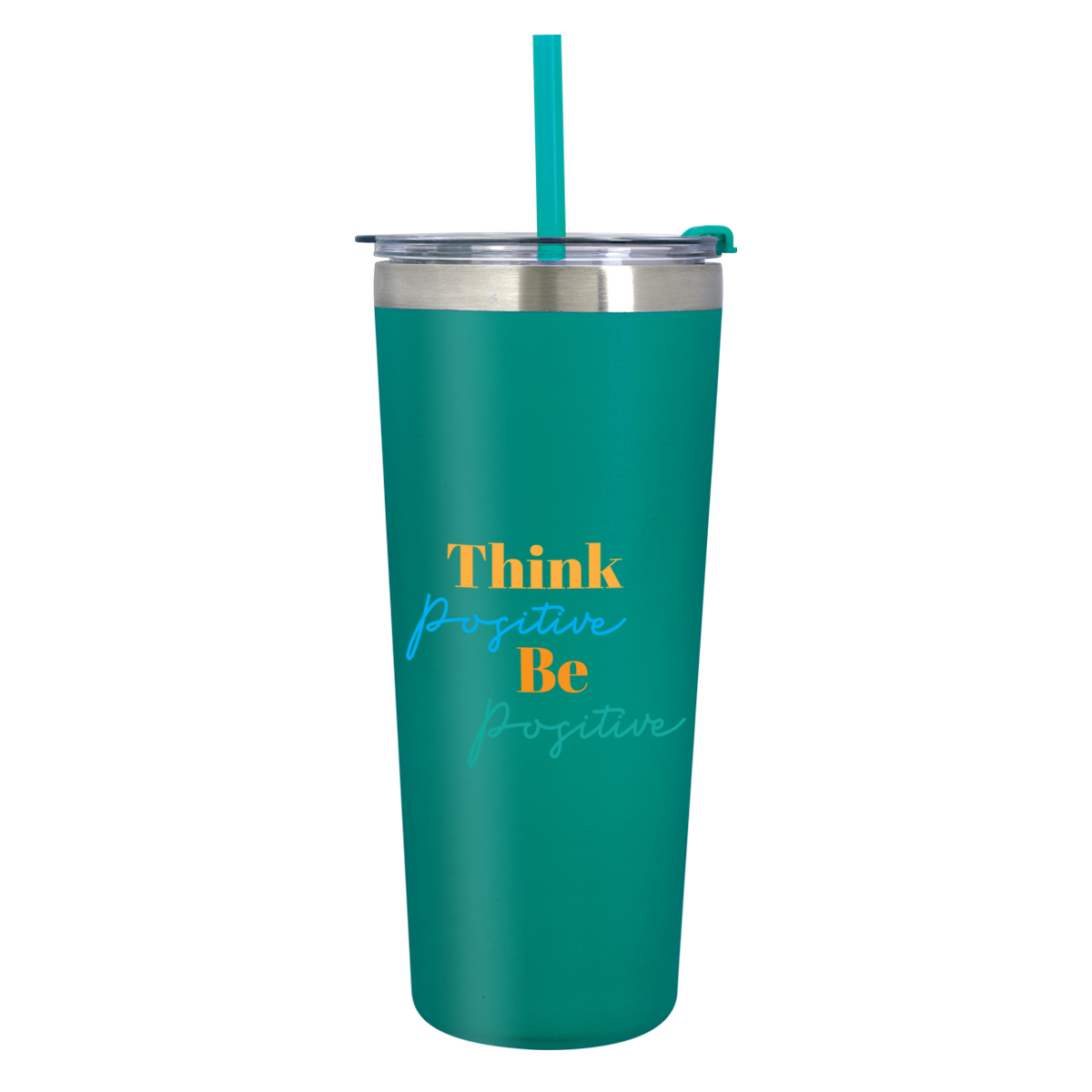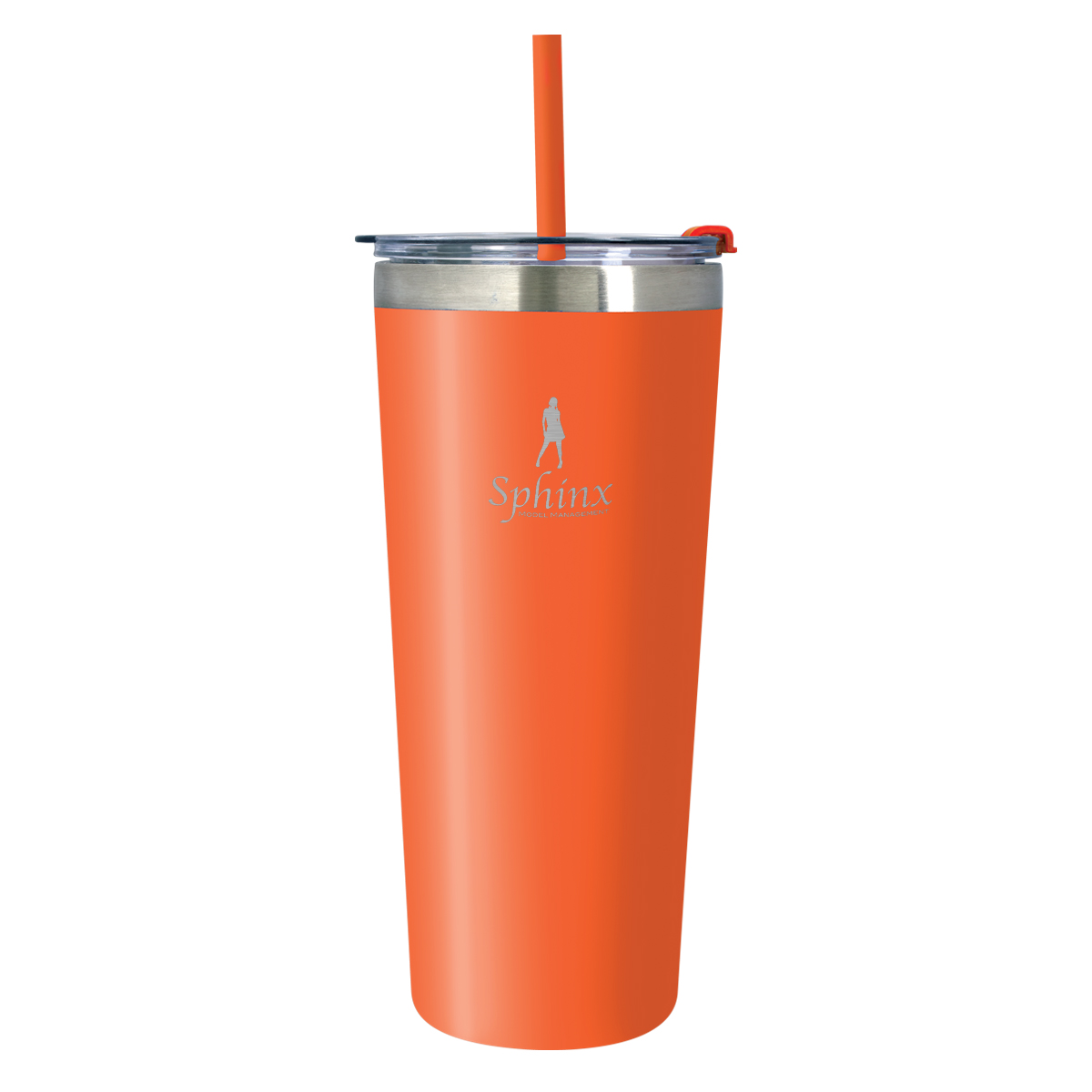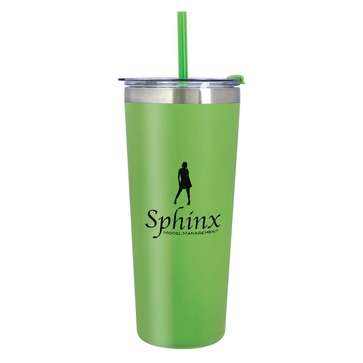 Stainless Steel Outer And Inner | Double Wall Construction For Insulation Of Hot Or Cold Liquids | Vacuum Insulated | Capacity Is 22 Oz. With Lid On | Snap-On, Spill-Resistant Flip Top Lid with Straw Hole and Matching 9 1/2" Straw | Non-Slip Bottom | Meets FDA Requirements | BPA Free | Hand Wash Recommended