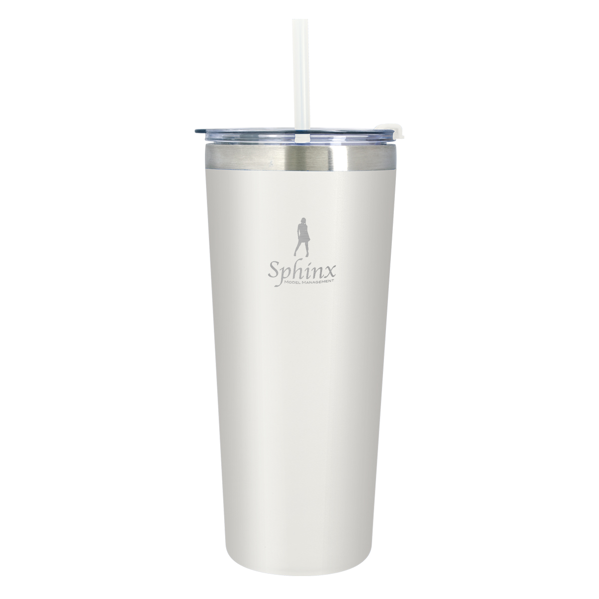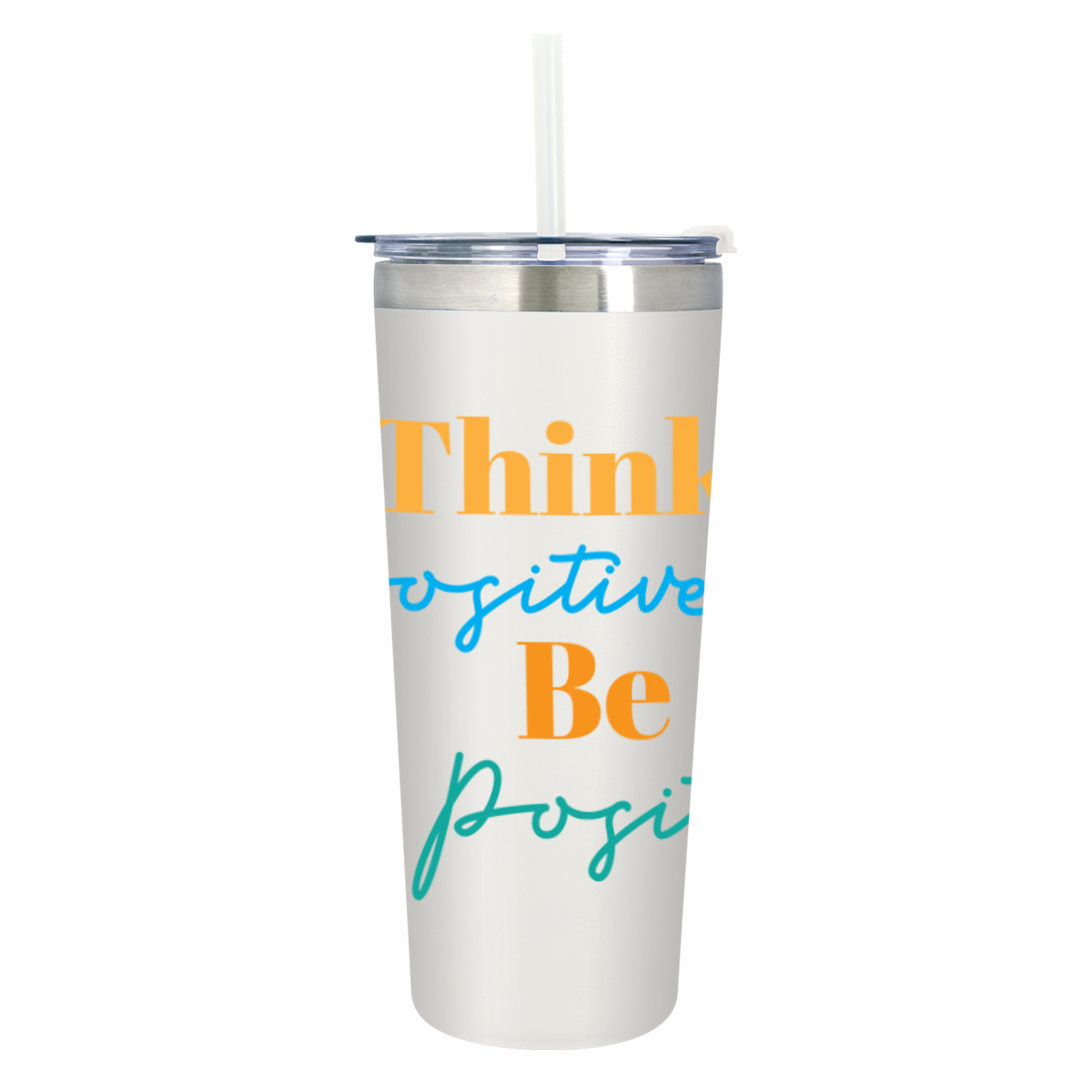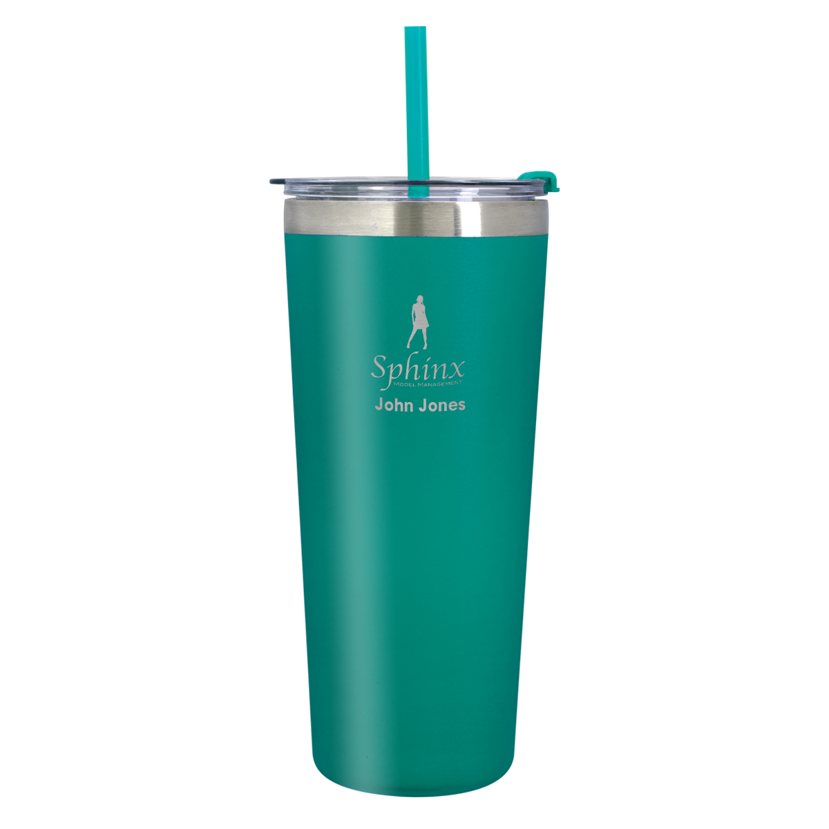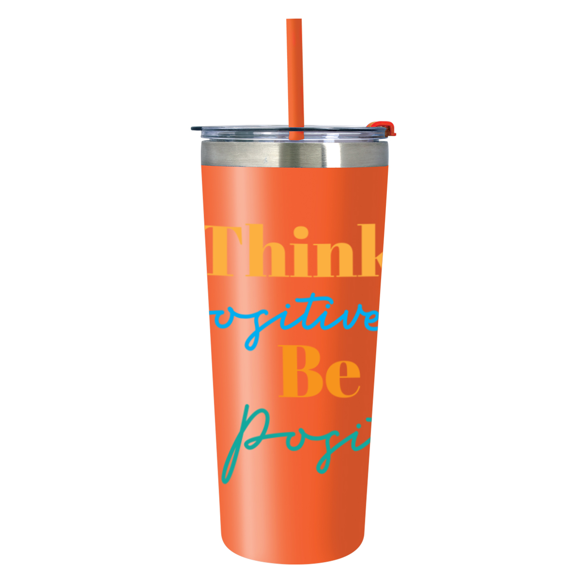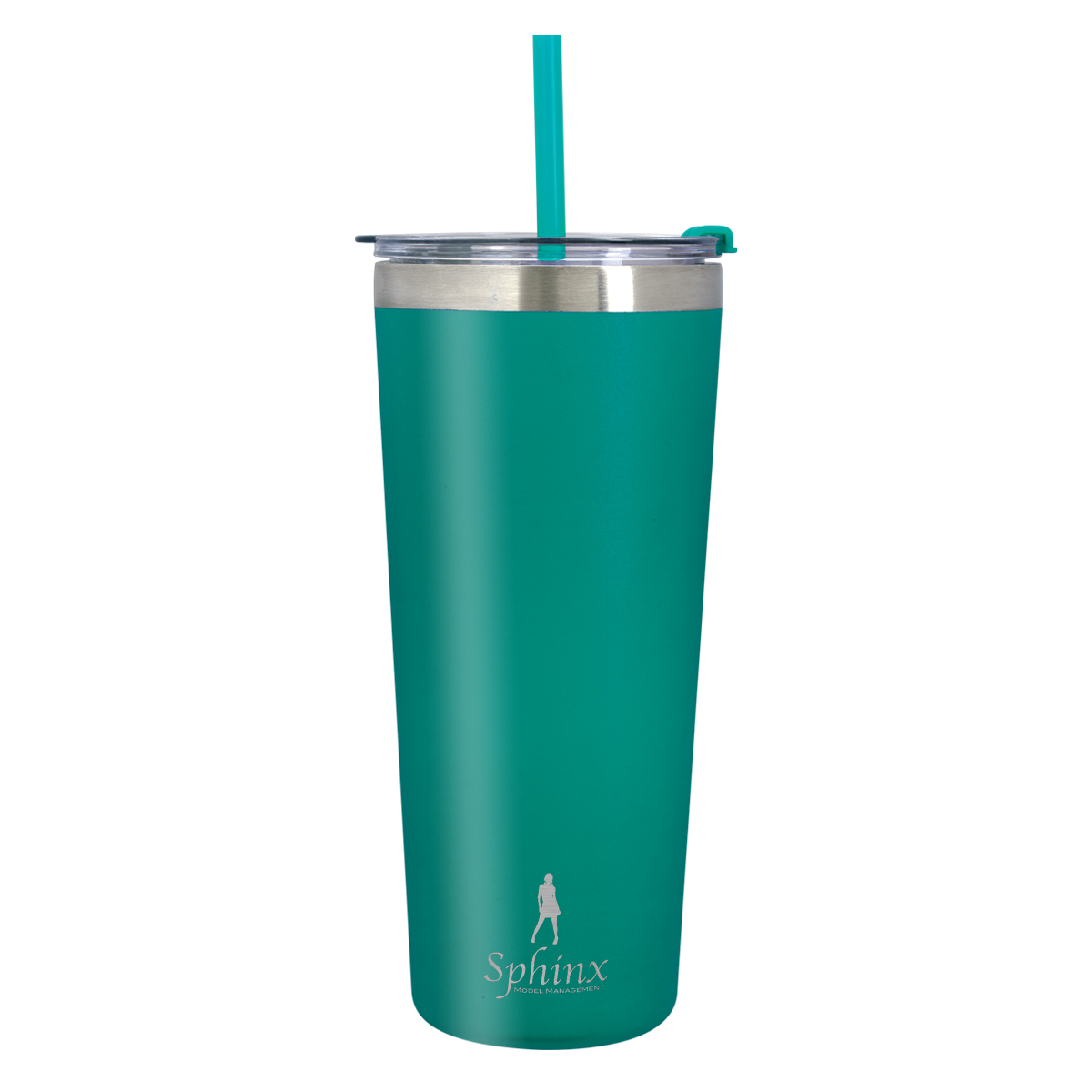 Stainless Steel Outer And Inner | Double Wall Construction For Insulation Of Hot Or Cold Liquids | Vacuum Insulated | Capacity Is 22 Oz. With Lid On | Snap-On, Spill-Resistant Flip Top Lid with Straw Hole and Matching 9 1/2" Straw | Non-Slip Bottom | Meets FDA Requirements | BPA Free | Hand Wash Recommended