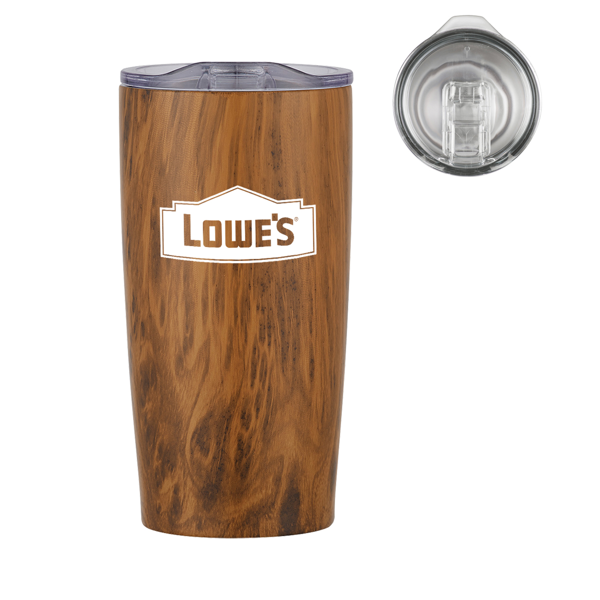 Includes 1-Color/1-Location Imprint On #5786 20 Oz. Woodtone Himalayan Tumbler And Stuffer Bag With Your Choice Of Filler | Stuffer Package Will Not Be Imprinted, Features White Bow | Stainless Steel Outer And Inner | Double Wall Construction For Insulation Of Hot Or Cold Liquids | Snap-On, Spill-Resistant Thumb-Slide Lid With Rubber Gasket | Due To Vacuum Insulation Technology, Capacity Is 18 Oz. With Lid On | Keeps Drinks Hot Or Cold Up To 6 Hours | Non-Skid Rubber Bottom | Meets FDA Requirements | BPA Free | Hand Wash Recommended