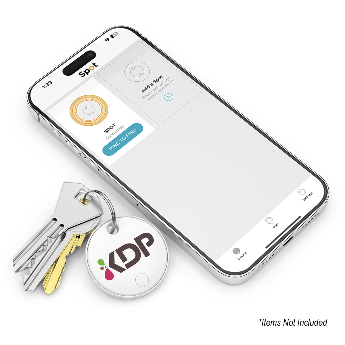 Wireless Two-Way Finder Featuring Bluetooth® 5.2 Technology | Attach The SpotX To Keys, Purse, Etc. | The Network Of Spot Users Can Help Find It, Two-Way Finding Helps Locate Your Spot And/Or Phone, Range Of 200 Ft. | Location History Will Map The Last Location SpotX Was Together With Your Phone | Out of Range Alerts Will Sound An Alert From Your Phone When SpotX Gets Too Far | Proximity Meter Is An Indicator Of The Connected Signal Strength Shown By Yellow Rings, Mark As Lost If A Spot Is Lost & Shows Disconnected | Compatibility: iOS 8.0 or Later & Android 4.3 OS or Later | Ring To Find Sounds An Alert From SpotX | Features A Replaceable Cell Battery | Free App For iOS And Android Devices | The Bluetooth® word mark and logos are registered trademarks owned by the Bluetooth SIG, Inc. and any use of such marks by Hit Promotional Products, Inc. is under license. Other trademarks and trade names are those of their respective owners.