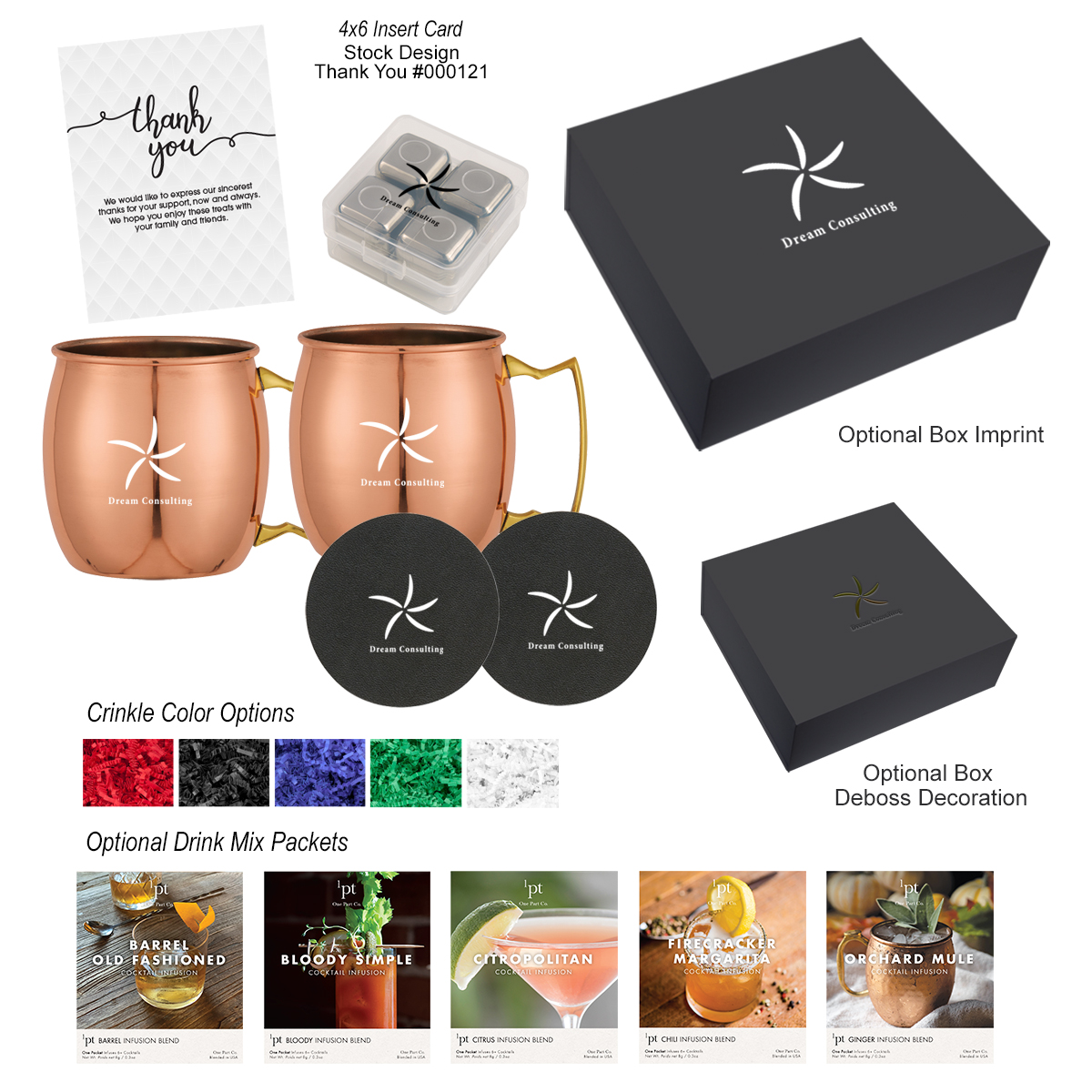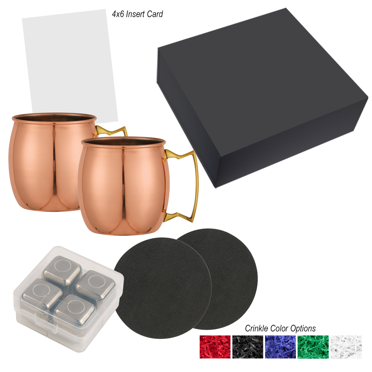 Set Includes Two #5741 – 20 Oz. Moscow Mule Mugs, #2142 Stainless Steel Ice Cubes In Case, And Two #2002 Bonded Leather Coasters | Pricing Includes 1-Color Imprint In 1-Location Each Item