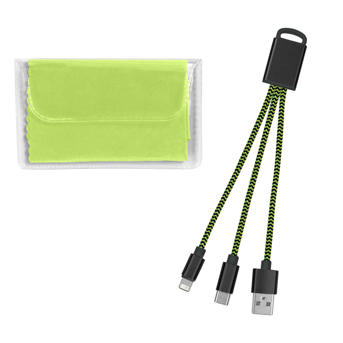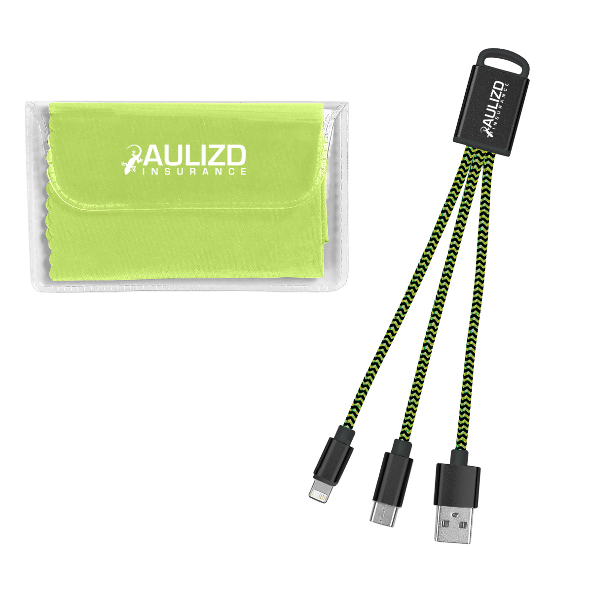 Set Includes #2829 - 3-In-1 Braided Charging Buddy And #6242 Microfiber Cleaning Cloth In Case | Pricing Includes 1-Color Imprint In 1-Location Each Item