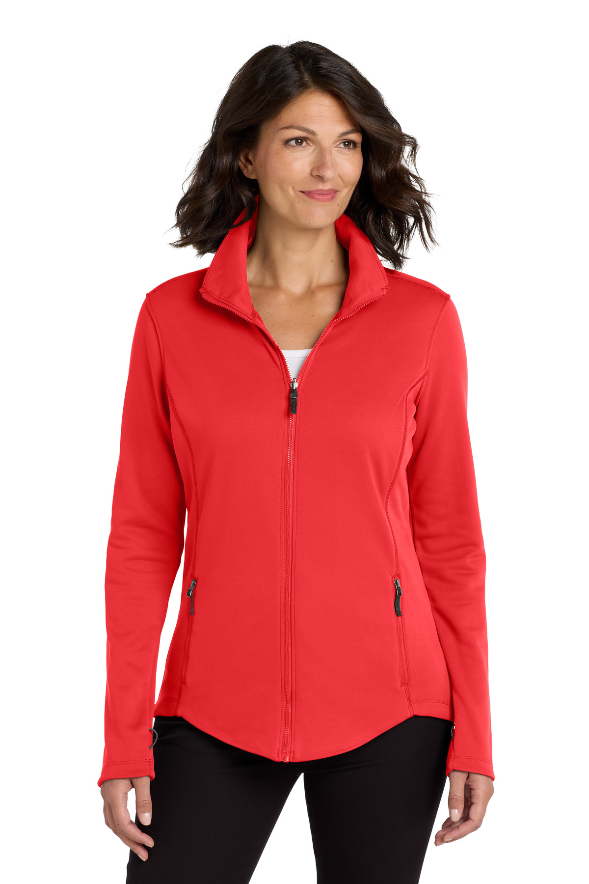 A smooth face brushed back and contrast coverstitching make this warm fleece jacket a classier alternative to more casual fleece. Can be zipped in and secured by snap attachments inside an outer Collective layer 5.9-ounce 100% polyester fleece Slightly longer length Ruching at collar Molded center front zipper Front reverse-coil zippered pockets Open cuffs and hem Tulip hem