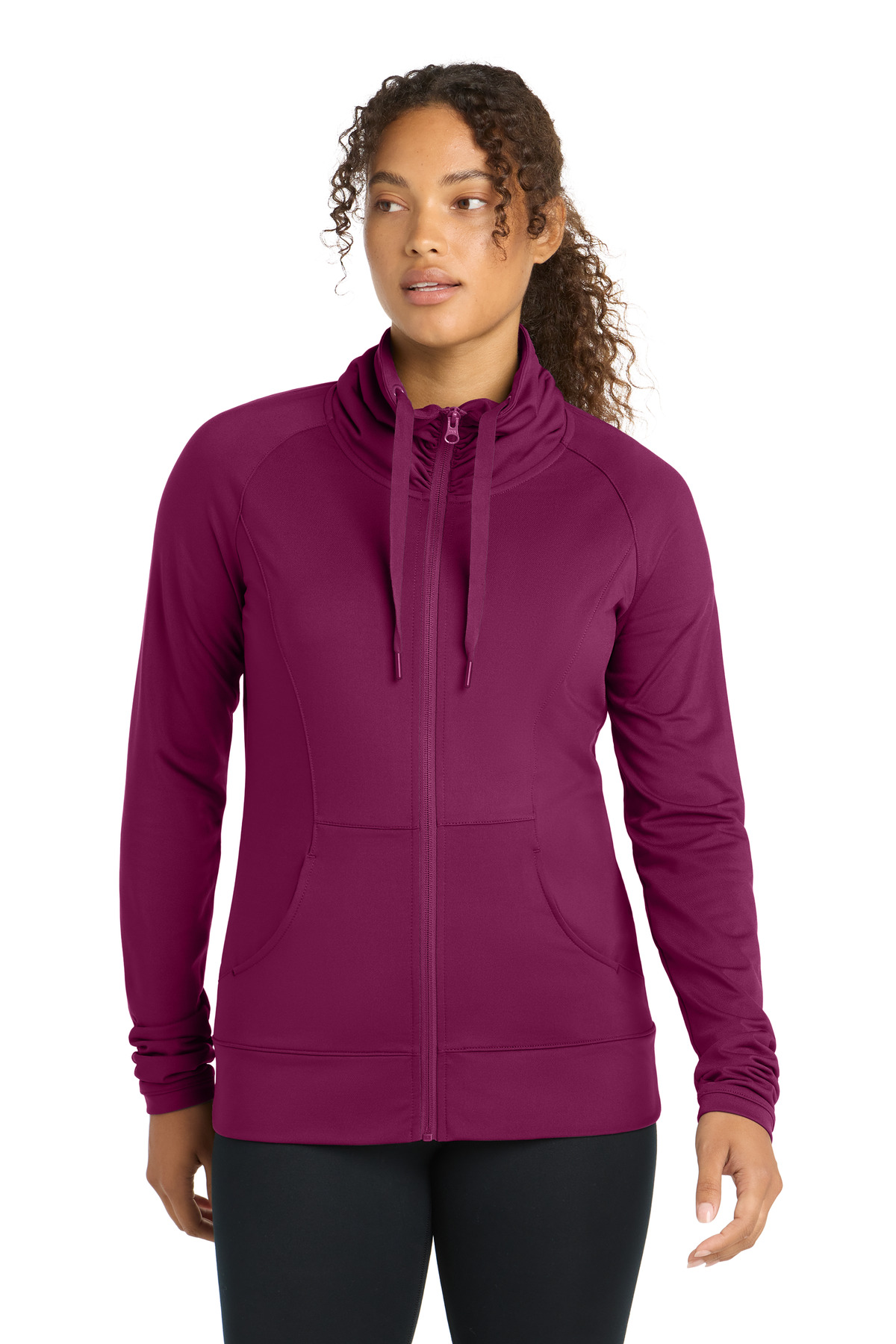 A stretchy moisture-wicking performance jacket with a soft-brushed backing and unique cowl collar.6.8-ounce 90/10 poly/spandex jersey Tag-free label Zip-through cowl collar with ruching Dyed-to-match drawcord Dyed-to-match Sport-Tek logo neck taping Reverse coil zipper Raglan sleeves Front pouch pockets Ruching at cuffs Self-fabric hem
