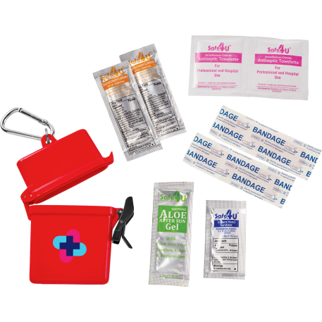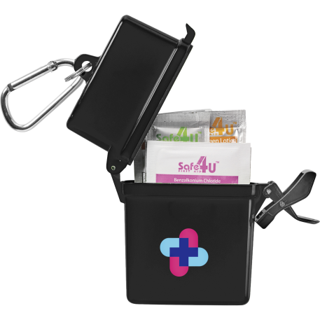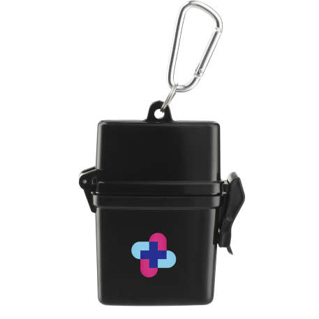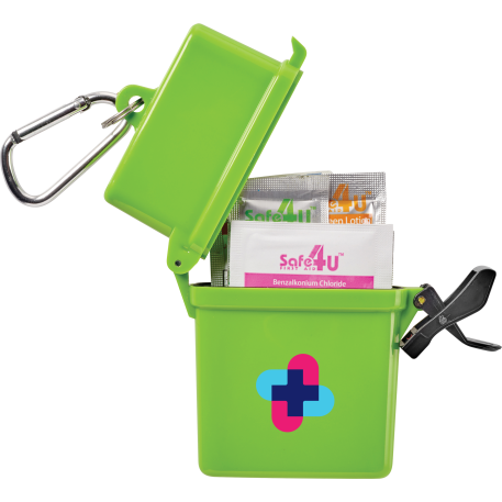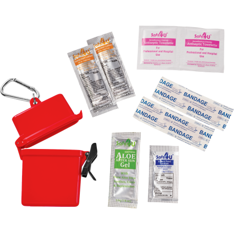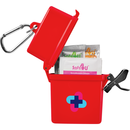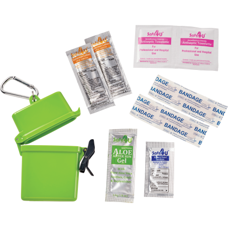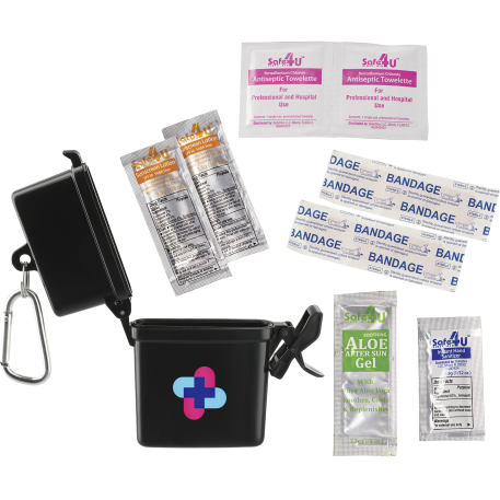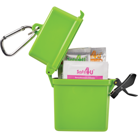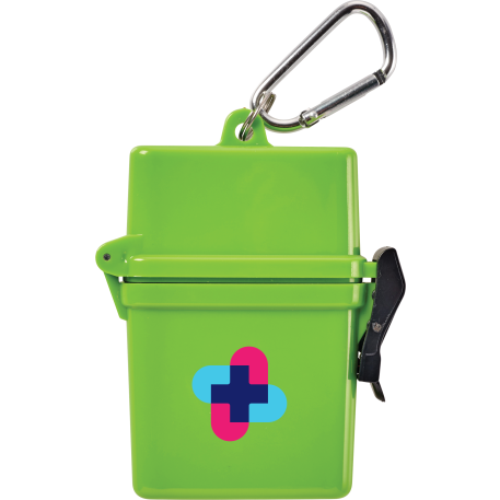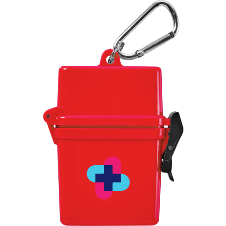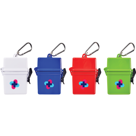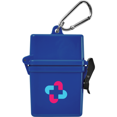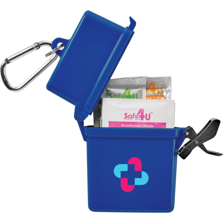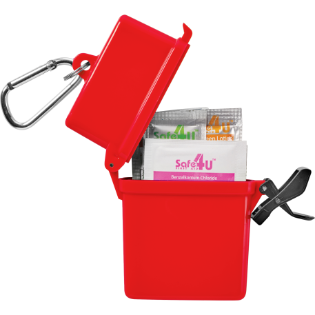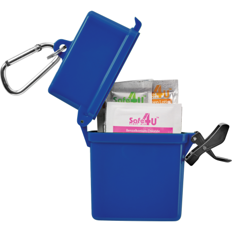 The Trek 8-Piece Waterproof First Aid Kit is a mini first-aid kit in a flip-top waterproof floating container with metal mini-carabiner for convenient first aid care. The kit includes 2 adhesive bandages, 2 antiseptic wipes, 1 Hand Sanitizer packet, (2) SPF30 Sunscreen packets and 1 aloe/after sun care packet. Sunscreen does not contain Octinoxate or Oxybenzone. Meets FDA requirements and is available for shipment within the United States (including Alaska, Hawaii & Puerto Rico). Not available for export. See General Information page for additional air shipment charges. Not available in Canada.