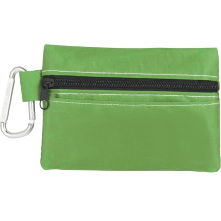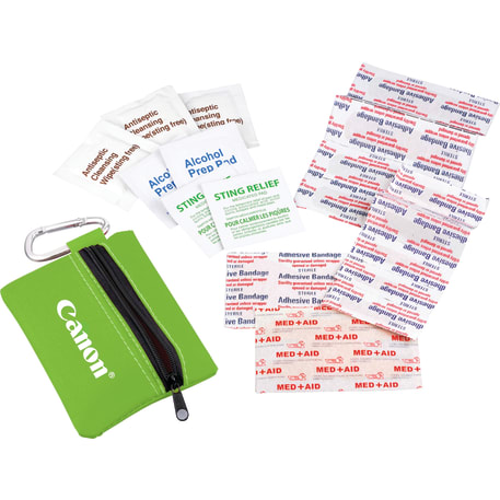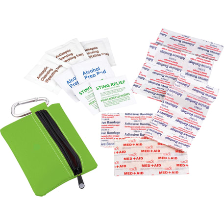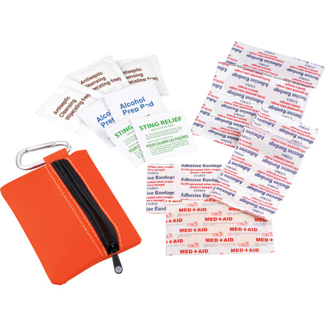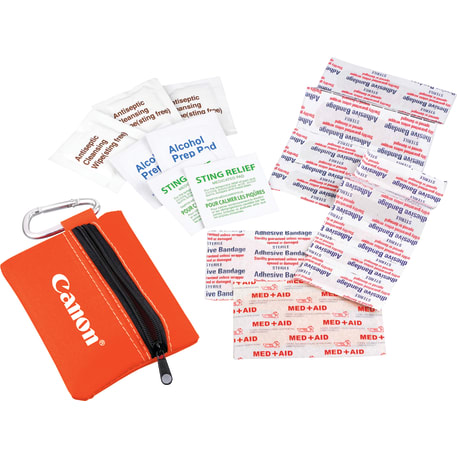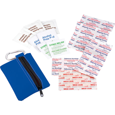 The Zippered 20-Piece First Aid Pouch comes with a silver mini carabiner, contains 3 antiseptic cleaning wipes, 5 standard size adhesive bandages, 6 small adhesive bandages, 1 adhesive butterfly bandage, 1 adhesive knuckle bandage, 2 alcohol wipes and 2 sting-relief wipes. Meets FDA requirements and is available for shipment within the United States (including Alaska, Hawaii & Puerto Rico). Not available for export. See General Information page for additional air shipment charges. Not available in Canada.