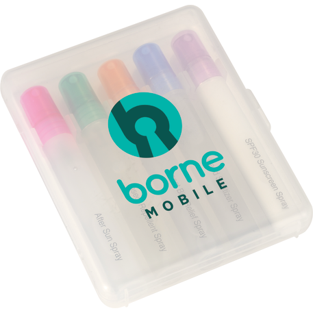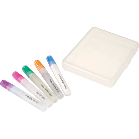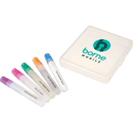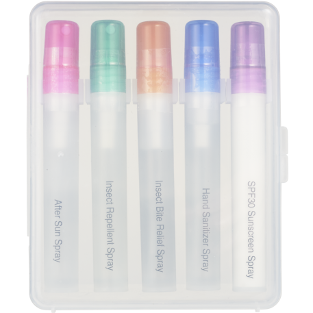 The Outdoor 5-Piece Wellness Set includes a 0.33 ounce pen spray bottle of Hand Sanitizer, SPF30 Sunscreen, After Burn Spray, Insect Repellent & After Bite Spray. All components are packed inside a sturdy travel case. Imprint available on outer case only. Sunscreen does not contain Octinoxate or Oxybenzone. Meets FDA requirements and is available for shipment within the United States (including Alaska, Hawaii & Puerto Rico). Not available for export. See General Information page for additional air shipment charges.